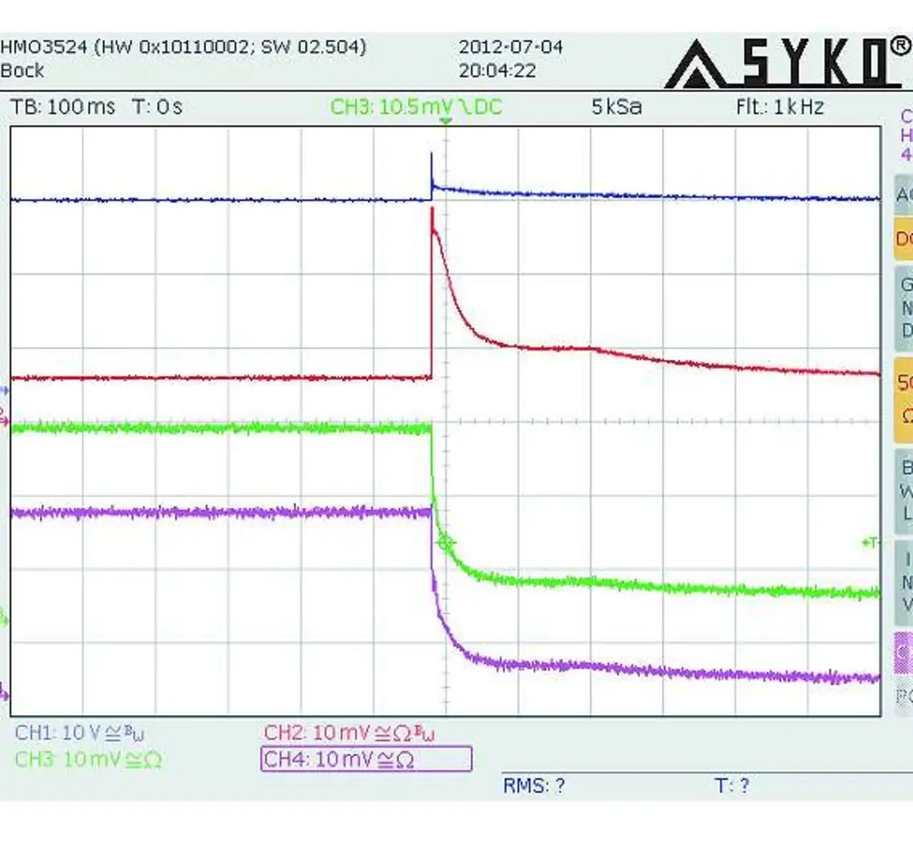 So zeigt das Bild 2 die Aufteilung der Ausgangsströme bei einem harten Lastabwurf bei 250 A und das Einschwingen am Bordnetz mit Batterie über 10 m Stromkabel und Fühlerleitung.