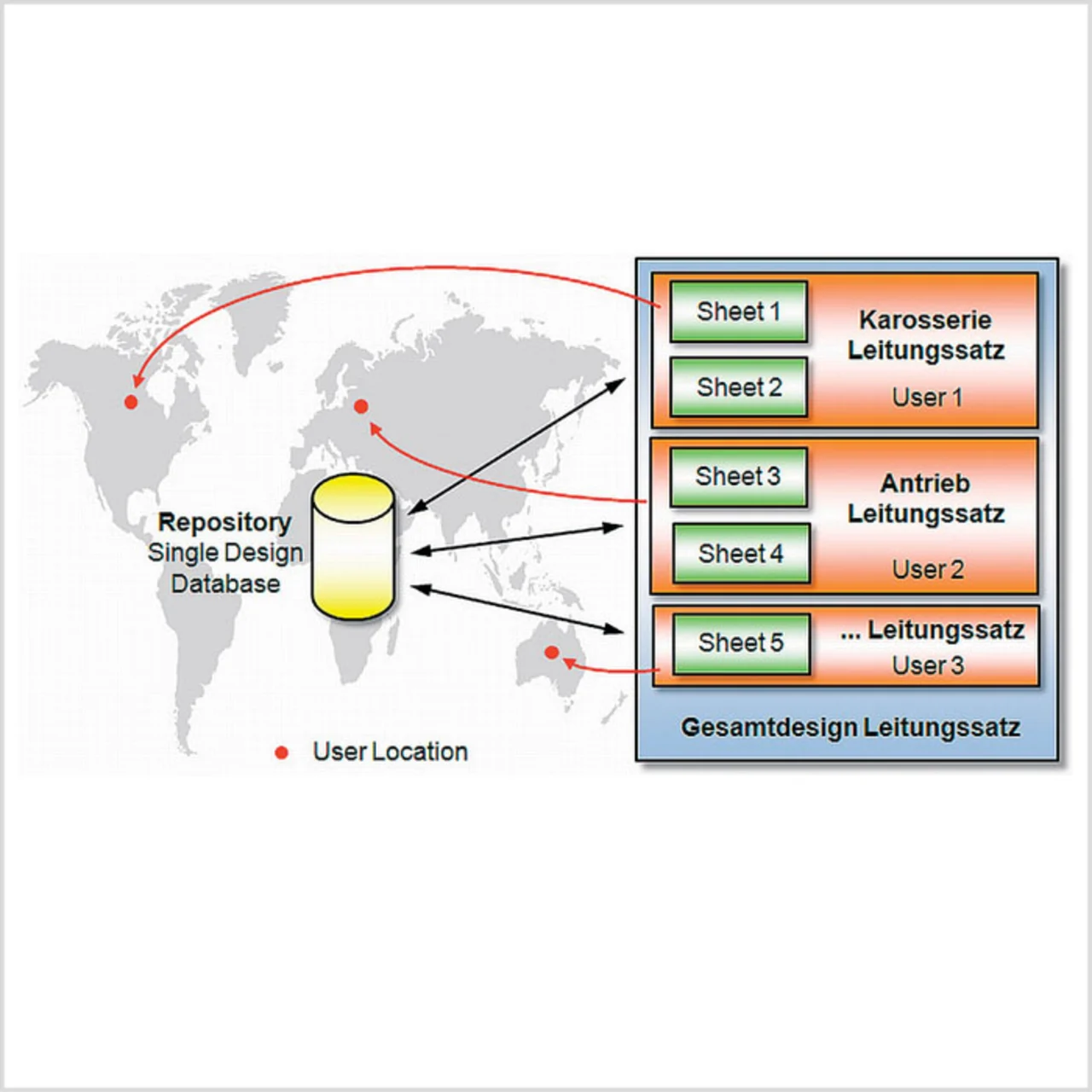 Saber Harness verwendet hierzu eine Technik, die auch als „Single Design Database“ (Bild 1) bezeichnet wird. Hierzu werden sämtliche Leitungssatzdaten in einem zentralen Repository gespeichert. Auf dieses Repository können beliebig viele Entwickler parallel zugreifen und erhalten bei Zugriff immer eine Kopie des Master Designs aus dem Repository. Um Konflikte bei Änderungen am Design zuvermeiden, ist es immer nur einem User möglich, Änderungen an der gerade ausgecheckten Einheit durchzuführen. Die anderen User haben dann nur lesbaren Zugriff. Um aber nicht das gesamte Bordnetzdesign durch einen einzelnen User zu blockieren, verwendet Saber Harness für den Aufbau von Bordnetzdesigns einen modularen Ansatz. Die im Schematic Editor gezeichneten Leitungssätze können auf mehrereDesign Sheets verteilt werden. Dies macht das gesamte Leitungsdesign übersichtlicher und ermöglicht, nun auch den Zugriff für verschiedene Design Sheets zu definieren. Somit haben mehrere User gleichzeitig Zugriff auf das Design und Schreibrechte für speziell ausgecheckte Sheets und können parallel Änderungen durchführen. Den prinzipiellen Ablauf beim Zugriff auf das zentrale Repository zeigt Bild 1.