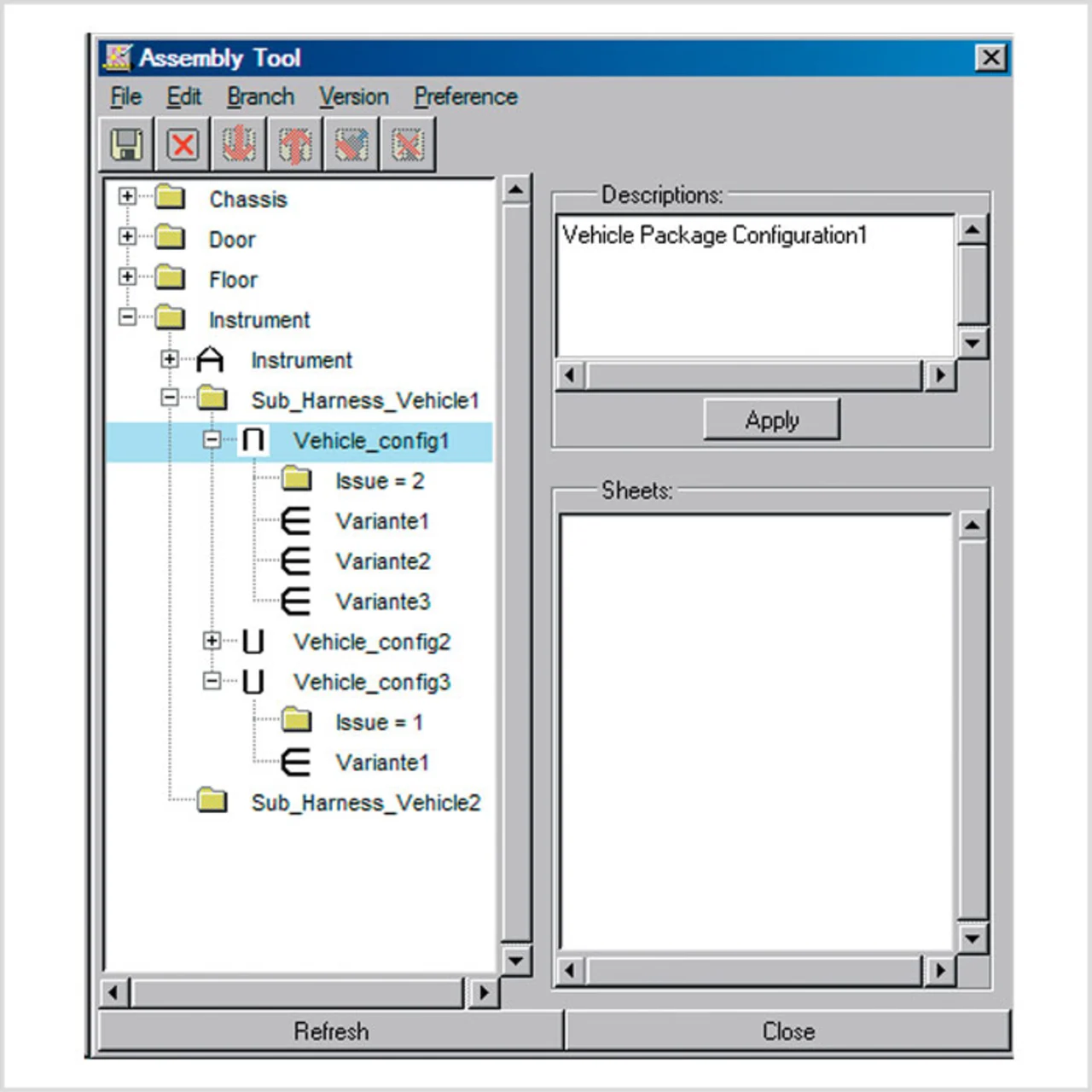Wenn es darum geht, die Konfiguration des Produktes „Auto“ festzulegen, soll es so einfach wie möglich sein, die sich ständig ändernden Anforderungen des Marktes zu adressieren. Deshalb bietet Saber Harness mit dem Assembly Tool die Möglichkeit, die Produktkonfiguration flexibel zu gestalten, ohne Änderungen an den Schematics des Leitungssatzes durchführen zu müssen. Bild 3 zeigt das Assembly Tool, in dem sämtliche Leitungsatzfamilien aufgelistet sind. Grafisch kann hier die Produktkonfiguration erfolgen, indem im linken Fenster ausgewählt wird, welche Komponenten des Gesamtsystems für eine spezielle Produktkonfiguration berücksichtigt werden. Ändert sich das Packaging für diese Konfiguration zu einem späteren Zeitpunkt, weil der Autohersteller entscheidet, eine Funktion für zukünftige Produktkonfigurationen auch zu berücksichtigen, so kann man diese Änderung direkt mit dem Assembly Tool durchführen. Eine Änderung der Designs ist nicht notwendig.