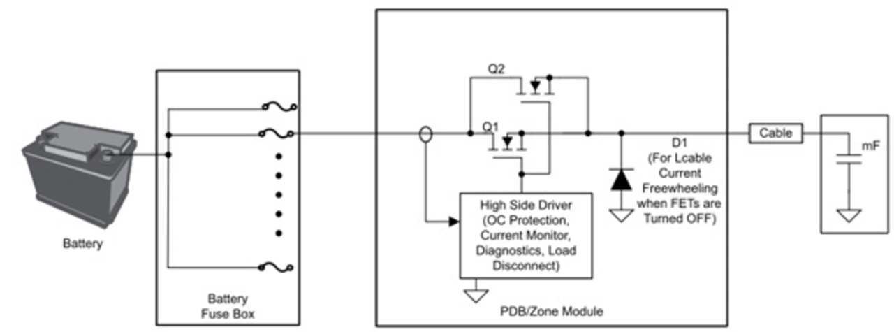 Wie in Bild 3 zu sehen ist, sind die High-Side-Treiberausgänge der Leiterplatte über Kabel, die zwischen einem und mehrere Meter lang sind, mit den jeweiligen ECUs verbunden. Ein für 50 A ausgelegter Kabelbaum hat beispielsweise einen Widerstand von 2 mΩ/m und eine Induktivität von 1,5 µH/m.