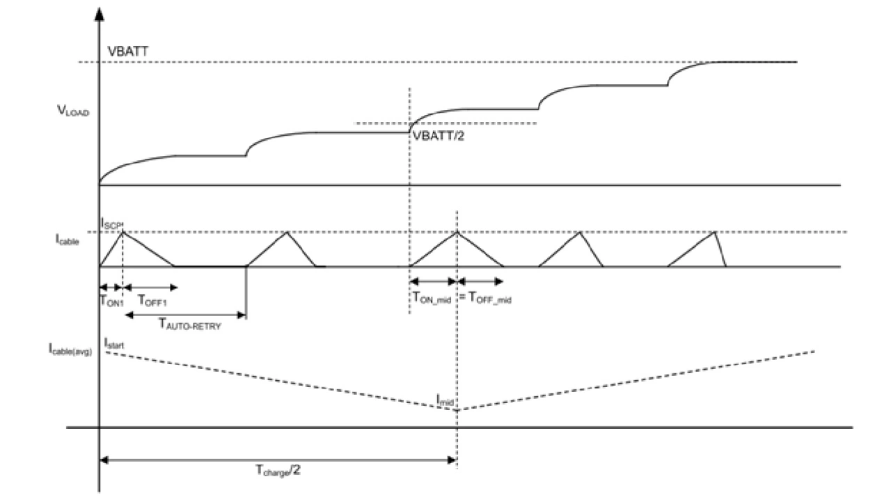 Der Ablauf des Ladevorgangs ist aus Bild 4 zu entnehmen: Während der Anlaufphase fließt ein Inrush-Strom in die ungeladenen Ausgangskapazität und löst ein Kurzschluss-Ereignis aus, sobald er die Ansprechschwelle des Kurzschlussschutzes (ISCP) erreicht. Der High-Side-Treiber schaltet daraufhin ab und unternimmt nach einer bestimmten Wartezeit (TAUTO-RETRY) einen Wiedereinschaltversuch. Dieser Zyklus setzt sich so lange fort, bis die Ausgangskapazität vollständig geladen ist und der Treiber in den normalen Betrieb übergeht.