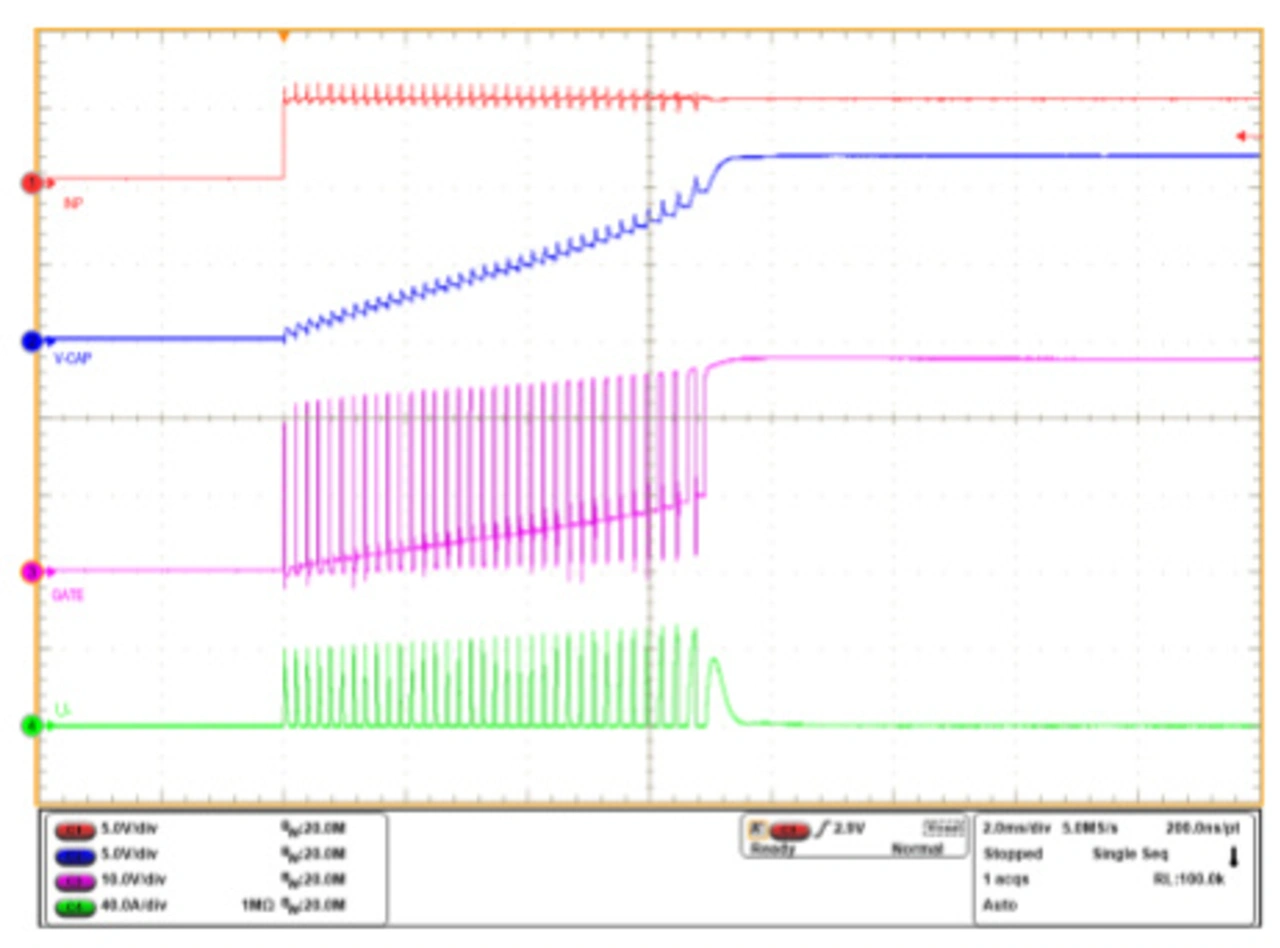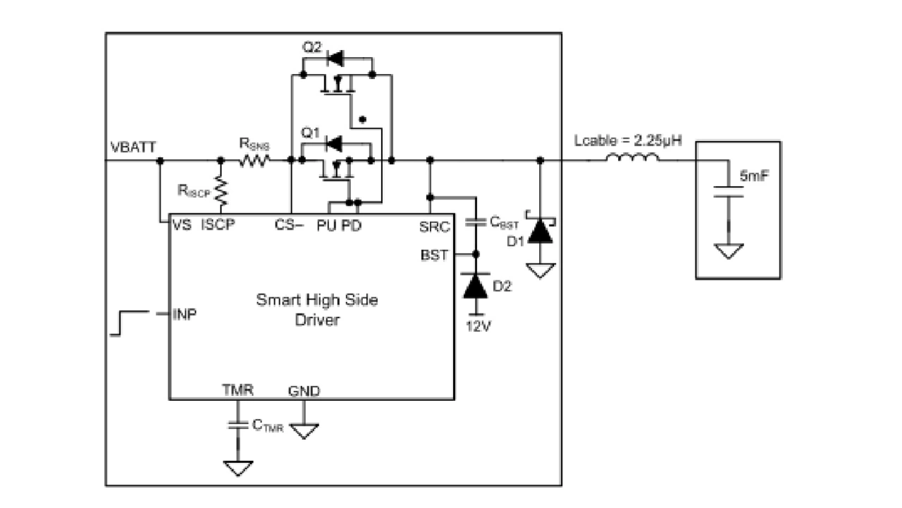 Reizvoll an dieser Methode ist, dass sie die bestehenden Ressourcen eines High-Side-Treibersystems (nämlich die Kabelinduktivität und die Diode D1) nutzt und durch Takten der High-Side-MOSFETs eine effiziente Lademethode implementiert. Anders als traditionelle Verfahren ist diese Lösung außerdem nicht vom SOA der FETs abhängig und benötigt weder einen sperrigen Precharge-Widerstand noch einen Precharge-FET oder einen Treiber. Stattdessen bedient sie sich des eingebauten Kurzschlussschutzes des High-Side-Treibers und arbeitet autonom, ohne dass irgendwelche externen Steuersignale oder komplexen Algorithmen erforderlich sind.