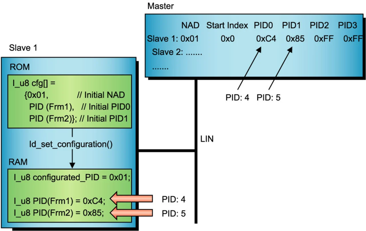 | Node_arributes { Slave1 { .... configured_NAD = 0x01; configurable_frames { Frm1; Frm2;} ... } } |