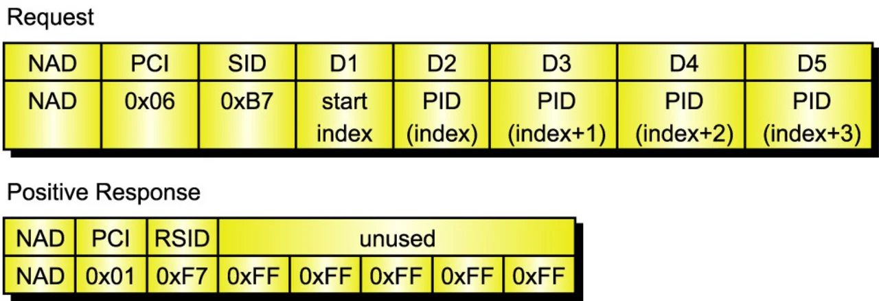 In D1 ist der Startindex der Liste gespeichert, d.h., dem Frame mit diesem Index wird die PID von Byte D2 zugewiesen, der nachfolgende Frame in der Liste erhält den PID von Byte D3 usw. Der erste Frame in der Liste hat den Index 0. Soll einem Frame kein PID zugewiesen werden, wird an der entsprechenden Stelle 0x00 eingetragen; hat der Slave keinen Frame mit dem entsprechenden Index in der Liste, kommt an die Stelle ein 0xFF. Der Slave akzeptiert den Service nur, wenn alle Parameter passen. In diesem Fall stellt er für den „Slave Response Frame“ (SRF) eine positive Antwort bereit.