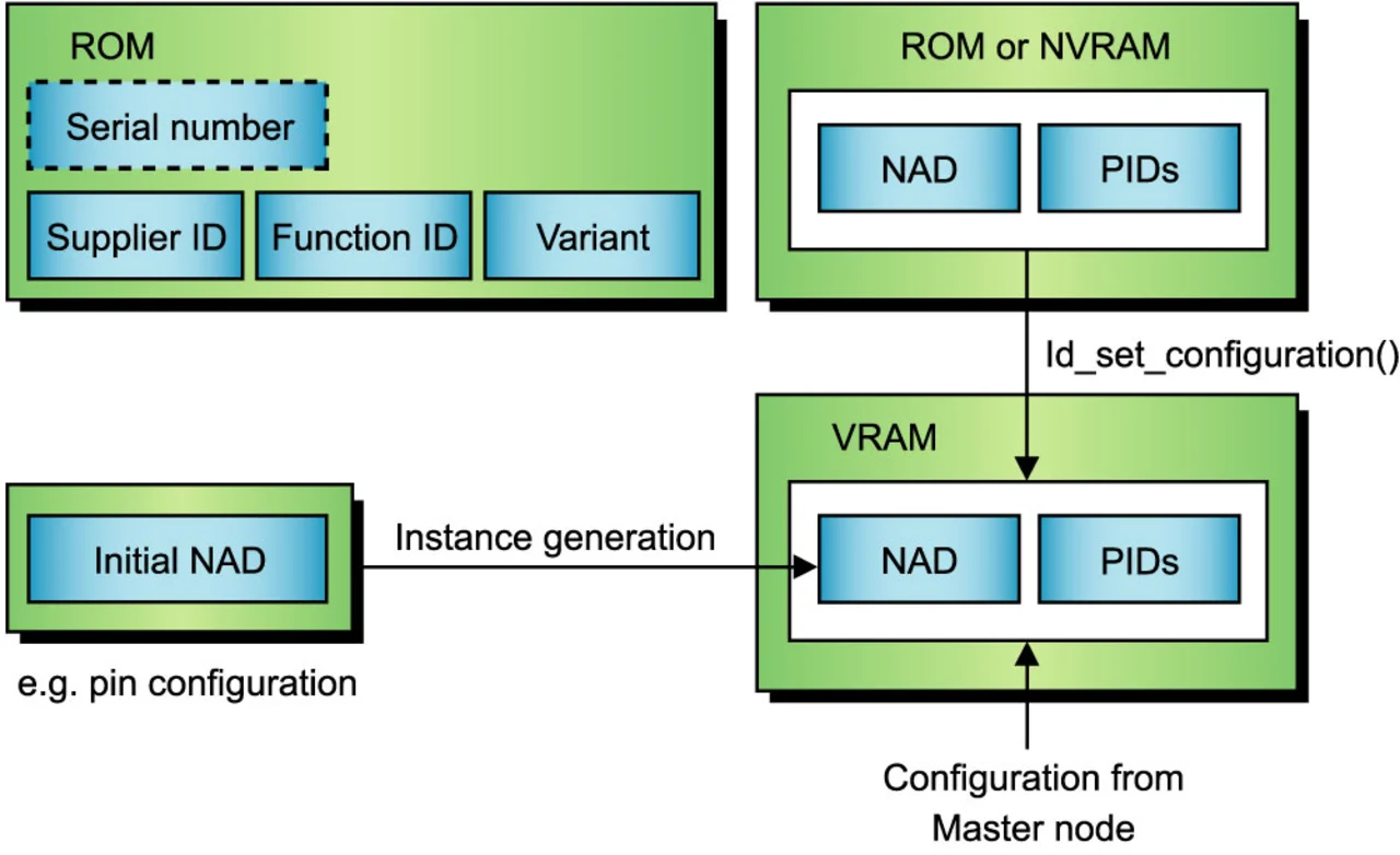 Das Knoten-Modell (Bild 9) hat sich durch den Wegfall der Message-IDs und die Definition der Konfigurationstypen geändert. Im ROM werden die Hersteller-ID, die Funktions-ID, die Versionsnummer sowie die Seriennummer (optional) gespeichert. Die Knoten-Adresse NAD und die PIDs können im ROM oder Flash-Speicher liegen. Sind sie konfigurierbar, werden sie mit der neuen API-Funktion ld_set_configuration() in das lokale RAM des Stacks kopiert. Die Knoten-Adresse NAD kann auf mehreren Wegen erzeugt werden, worauf nachfolgend eingegangen wird. Die Spezifikation unterscheidet drei Konfigurationstypen: