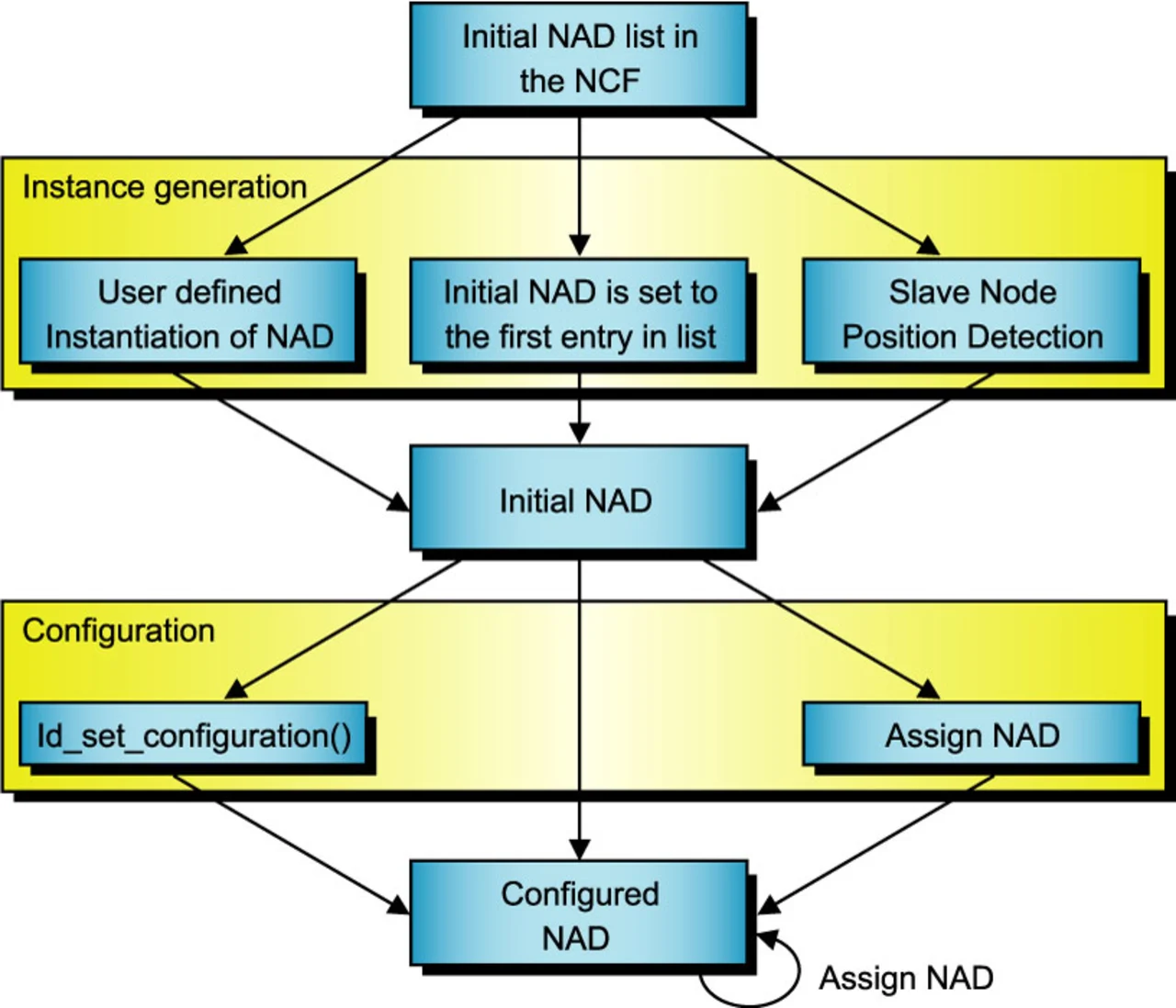 Ist hingegen von einem Gerätetyp nur ein Knoten im Cluster, kann einfach die erste initiale NAD aus der Liste im NCF verwendet werden. Sind die initialen NADs im Cluster eindeutig, lassen sie sich ohne Modifikation nutzen, ansonsten muss mit Hilfe der Hersteller- und Funktions-ID jedem Knoten eine eindeutige NAD (configured NAD) zugewiesen werden.