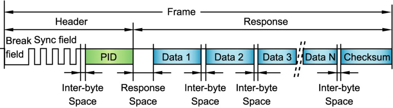 Die Frame-Struktur hat sich nicht ge-ändert, allerdings wurden die immer schon vorhandenen „Inter-byte Spaces“ nun auch in der Spezifikation berücksichtigt (Bild 3). Die „Inter-byte Spaces“ entstehen bei einer asynchronen Schnittstelle durch die Sendepausen zwischen zwei Bytes. Die Zeitdefinitionen für die minimale und die maximale Frame-Dauer haben sich dadurch nicht geändert.