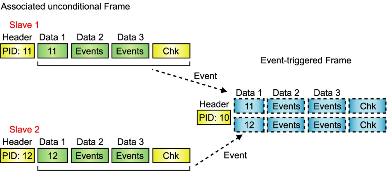 Für den Event Triggered Frame wurde explizit das Verhalten beim Auftreten einer Kollision definiert. Mit diesem Frame können mehrere Knoten gleichzeitig nach einem Ereignis gefragt werden. Dazu muss in jedem Knoten, der mit dem Event Triggered Frame abgefragt wird, ein assoziierter Unconditional Frame mit folgenden Eigenschaften definiert werden: