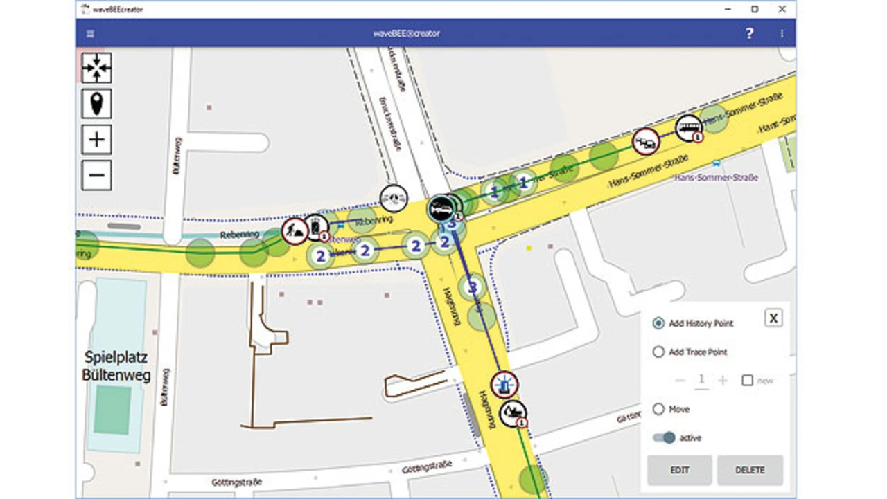Die Erstellung der V2X-Szenarien erfolgt hierbei schnell und zuverlässig über den waveBEE creator. Der Editor sorgt gleichzeitig dafür, dass nur spezifikationskonforme Nachrichten definiert und erzeugt werden. Ein identisches Testszenario lässt sich mithilfe der waveBEE to-go aus dem Labor auf die reale Straße transferieren, um mit dem echten Fahrzeug unter Realbedingung das gesamte Szenario zu »erfahren«.