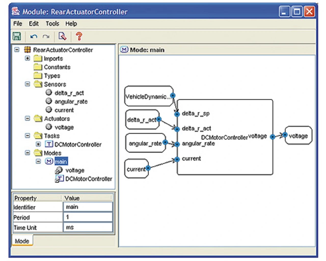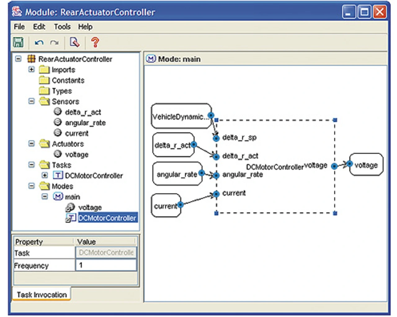 Die TDL-Komponente RearActuatorController hat in dieser vereinfachten Fallstudie nur eine einzige Task (DCMotorController). Der Modus main ist der einzige Modus in der TDL-Komponente RearActuatorController.
