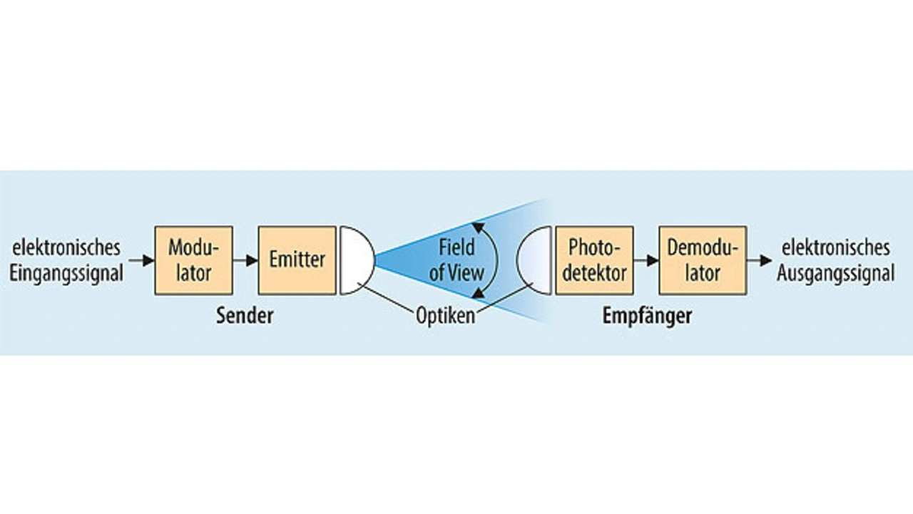 Die drahtlose optische Kommunikation findet statt zwischen einer Sende- und Empfangseinheit – auch als Transmitter bzw. Receiver bezeichnet. Ein schematischer Aufbau einer optischen Übertragungsstrecke ist in Bild 1 dargestellt. Die zu übertragenden Daten in Form von Bits werden aus einer Quelle wie einem Ethernet-Port empfangen. Ein Treiberschaltkreis variiert die Emmissionsintensität des Emitters und wandelt so das eingehende elektrische Signal in ein optisches um. Häufig verwendete Emitter sind Lumineszenz- oder Laserdioden. Vermehrt kommen auch spezielle Ausführungen wie Edge-emmiting LEDs (ELED) oder Vertical Cavity Surface (VCSEL) in der optischen Datenübertragung zur Anwendung, weil diese die Vorteile beider Technologien kombinieren.