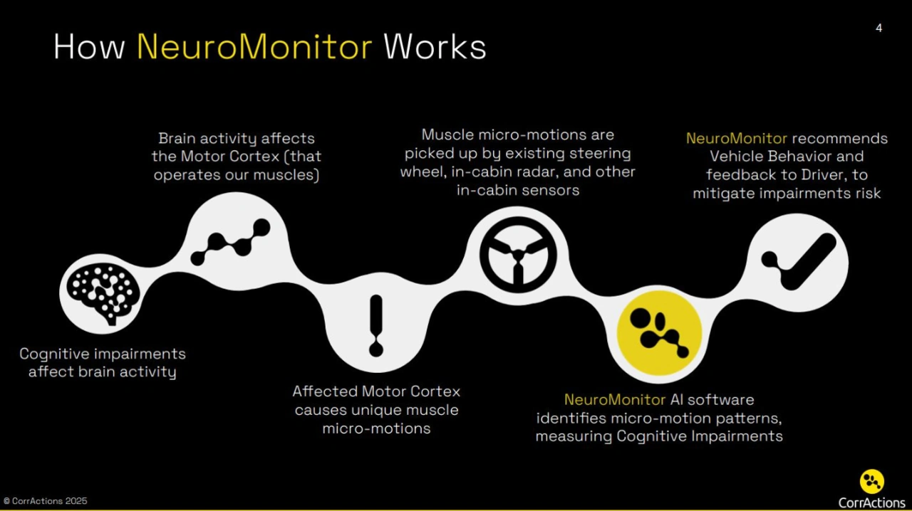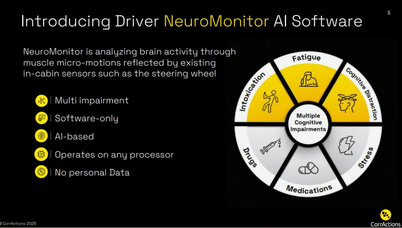 Das von CorrActions entwickelte Neuro-Monitoring bietet eine robuste und zuverlässige Möglichkeit, Fahrverhalten unter Alkohol einwandfrei zu erkennen und kann das Ergebnis von Alkoholsensoren im Fahrzeug differenzieren oder absichern. Die NeuroMonitor-Lösung nutzt eine einzigartige, patentierte Technologie, die die Gehirnaktivität anhand von Mikrobewegungen der Muskeln analysiert, die von vorhandenen Sensoren im Fahrzeuginneren, wie z. B. dem Lenkrad, erfasst werden. Es handelt sich um eine reine Software-Lösung auf KI-Basis, die den gesamten Bereich der Blutalkoholkonzentration (BAK) mit nahezu null Fehlalarmen erkennt - lange bevor körperliche Symptome auftreten oder ohne, dass der Fahrer selbst etwas zur Detektion unternehmen muss. Das System übertrifft damit die begrenzten Möglichkeiten kamerabasierter Lösungen deutlich und reagiert unverzüglich. Denn im Gegensatz zu Alkoholtestern oder berührungsbasierten Sensoren überwacht es den kognitiven Abbau in Echtzeit und kann nicht umgangen werden. Damit entfällt für Autohersteller die Notwendigkeit, zusätzliche Hardware hinzuzufügen, um die neuen Protokollanforderungen zu erfüllen, auch weil es mit jedem Prozessor in jedem Fahrzeug funktioniert.