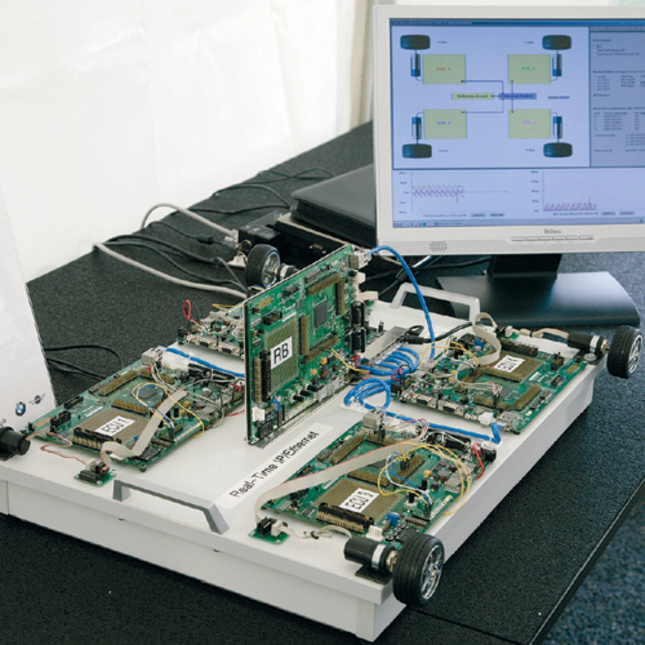 Für den Aufbau des Demonstrators (Bild 2) wie auch für die Umsetzung in einem realen Fahrzeug wurde von den BMW-Forschern ein Standard-Ethernet-Protokoll verwendet, das u.a. mit einem Priorisierungsmechanismus arbeitet, der für die notwendige Übertragungsqualität (QoS) sorgt und somit auch sicherheitskritische und echtzeitfähige Anwendungen erlaubt.