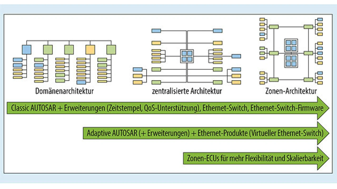 Während bisherige E/E-Netzwerkarchitekturen einzelne Applikationsdomänen zusammengefasst haben (Bild 1), bietet eine auf Automotive Ethernet aufbauende, flächendeckende Netzwerk-Infrastruktur im Fahrzeug die Möglichkeit, über diese Grenzen hinweg Sensoren und Aktoren zu teilen und Applikationen zu zentralisieren. Durch die laufende Zunahme des Funktionsumfangs im Fahrzeug wachsen jedoch auch Anzahl und Komplexität der Steuergeräte (Electronic Control Units, ECUs). Abhilfe bietet hier die Zentralisierung von Funktionen durch die Einführung von Server-ECUs, die viele Anwendungen auf Performance CPUs ausführen können.
