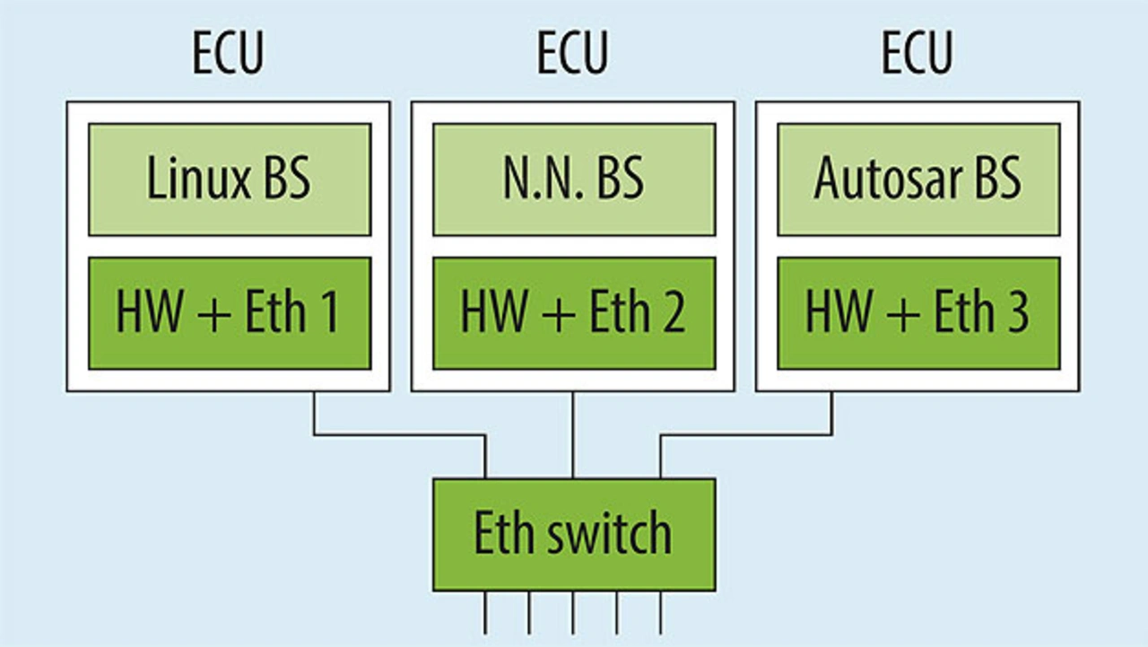 In traditionellen Designs werden einzelne ECUs mit jeweils einer eigenen, physikalischen Ethernet-Schnittstelle an das Automotive Ethernet-Netzwerk angebunden (Bild 2).
