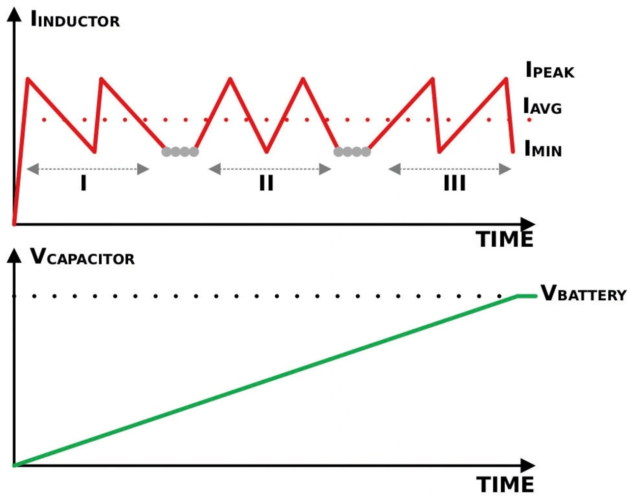 Beachtet werden muss die in Gleichung 7 ausgedrückte Relation zwischen L, dI und FSW_MAX. Da L und dI jeweils umgekehrt proportional zu FSW sind, müssen die Werte unbedingt so gewählt werden, dass die maximale Schaltfrequenz (FSW_LIMIT) nicht überschritten wird. Die gewählte Induktivität sollte angemessene Werte für den RMS-Strom (IRMS > ICHARGE), den Sättigungsstrom (ISAT > IL PEAK) und die Spannung ergeben und hier jeweils genügend Reserven aufweisen.