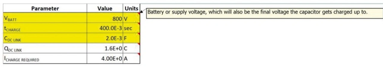 Als erstes muss die Höhe des erforderlichen Ladestroms (ICHARGE) bestimmt werden. Er berechnet sich, wie aus Gleichung 2 hervorgeht, aus der Gesamtladungsmenge (QDC_LINK) im Zwischenkreiskondensator, dividiert durch die gewünschte Vorladezeit (tCHARGE).