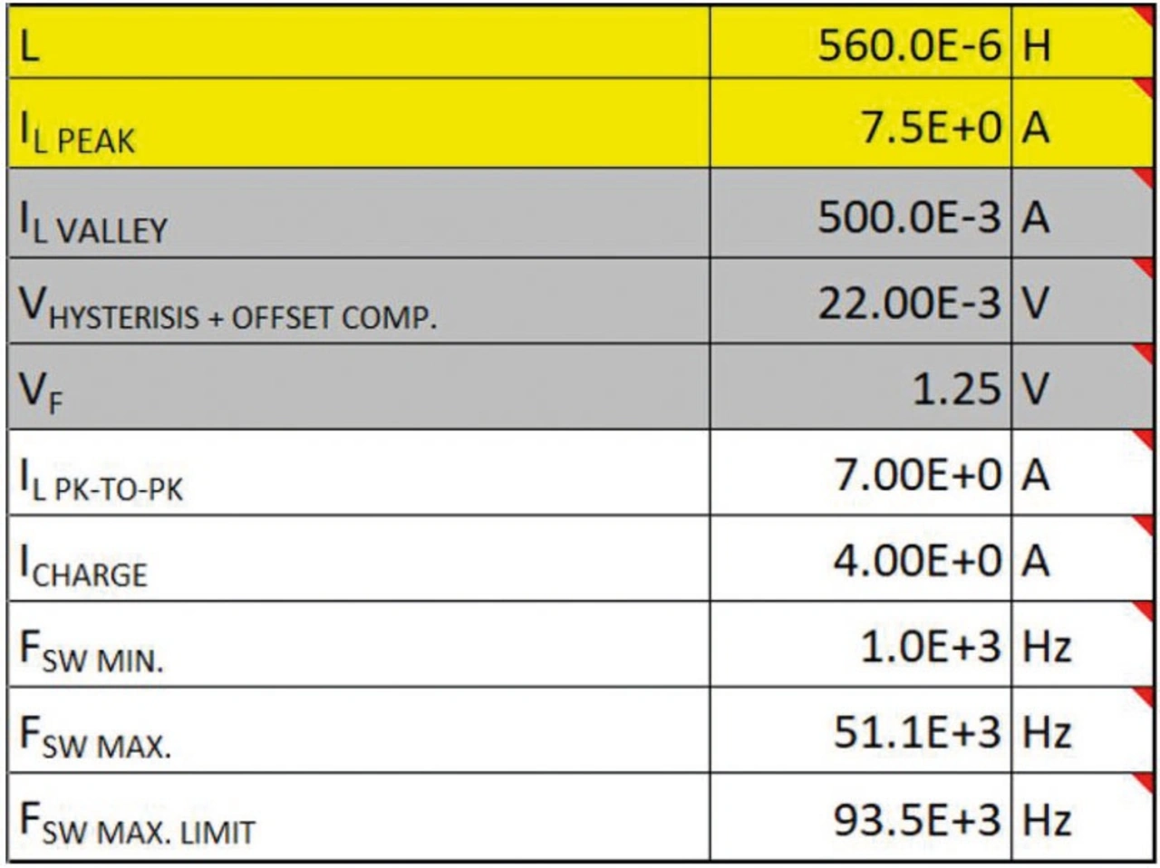 Der in Bild 5 gezeigte Teil des Berechnungs-Tools errechnet den tatsächlichen durchschnittlichen Ladestrom (ICHARGE) sowie FSW_MAX. Der durchschnittliche Spulenstrom ist im Prinzip identisch mit ICHARGE, wobei ICHARGE größer oder gleich dem im vorigen Abschnitt berechneten Wert von ICHARGE_REQUIRED sein muss, damit die gewünschte Ladezeit (tCHARGE) eingehalten wird.