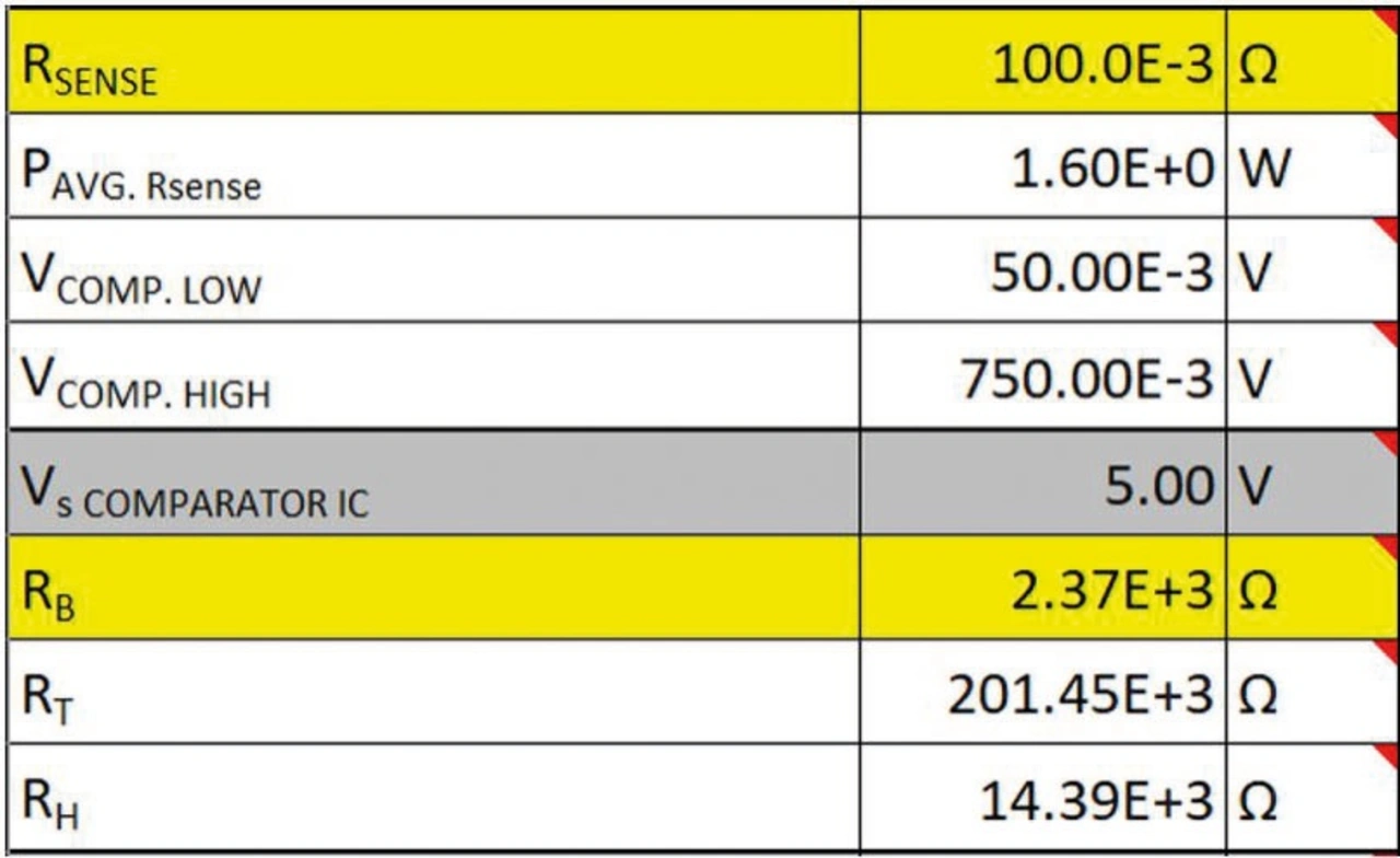 Der in Bild 6 gezeigte Teil des Berechnungs-Tools berechnet die Werte des unteren Widerstands (RB), des oberen Widerstands (RT) und des Hysteresewiderstands um die Hystereseschaltung so, dass die im vorigen Teil angegebenen Grenzwerte für den maximalen und den minimalen Spulenstrom (IL_PEAK bzw. IL_VALLEY) eingehalten werden. Einzugeben sind die Werte des Strommesswiderstands (RSENSE) und von RB, die jedoch flexibel sind und je nach Bedarf geändert werden können. Es muss darauf geachtet werden, dass die Versorgungsspannung des Komparators (VS_COMPARATOR) korrekt ist.