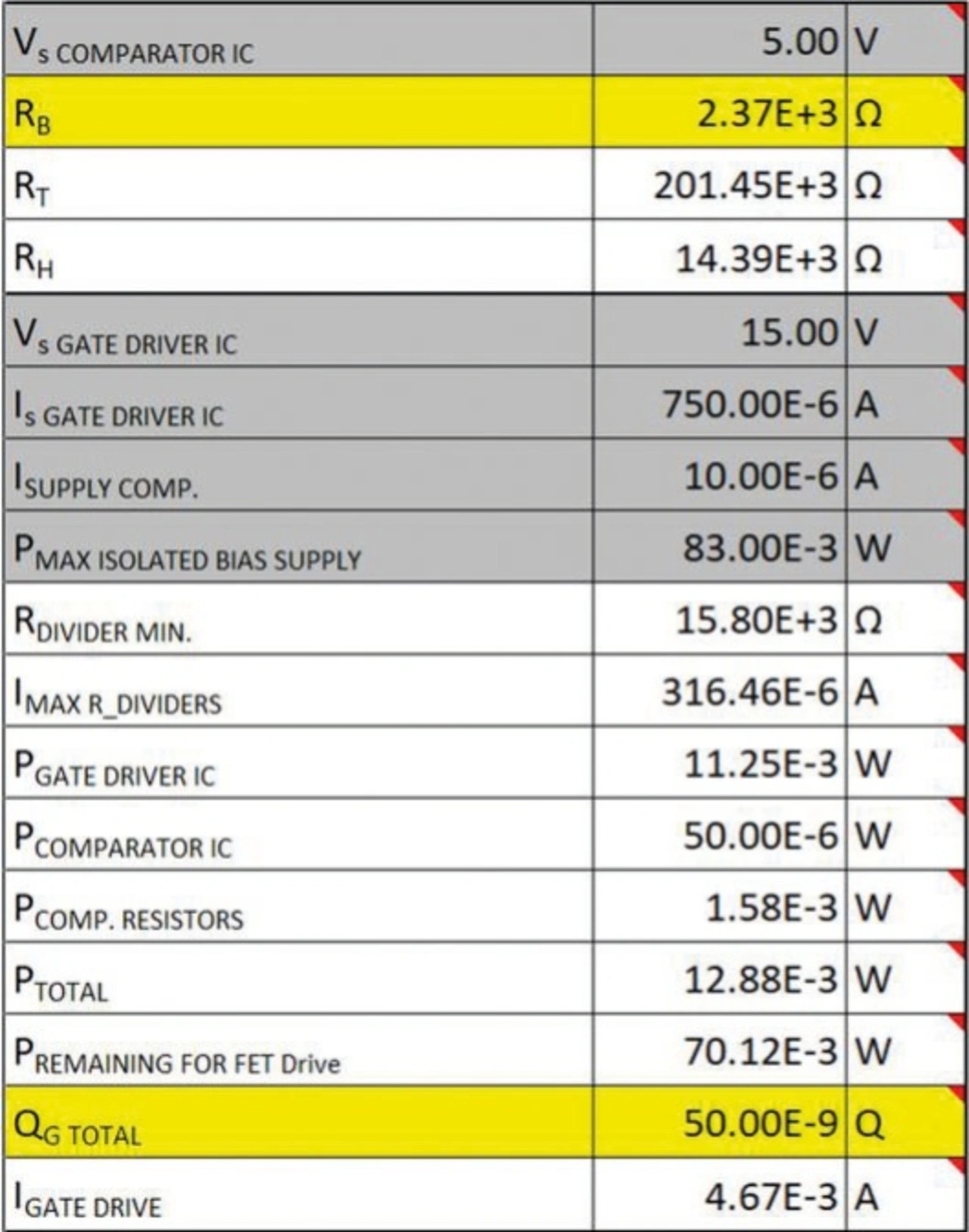 Der in Bild 7 dargestellte Teil des Rechen-Tools berechnet die zum Schalten des MOSFETs verfügbare Leistung (PREMAINING_FOR_FET_DRIVE), indem zunächst die Gesamtleistungsaufnahme (PTOTAL) im Zusammenhang mit den Widerständen der Hystereseschaltung (PCOMP_RESISTORS), dem Gate-Treiber-IC (PGATE_DRIVER_IC) und dem Komparator-IC (PCOMPARATOR_IC) berechnet und diese von der maximal verfügbaren Leistung des TPSI3052-Q1 (PMAX_ISOLATED_BIAS_SUPPLY) subtrahiert wird. Eingegeben werden müssen die Gesamt-Gate-Ladung des MOSFETs (QG_TOTAL), die Ruhestromaufnahmen der Bauelemente (IS_GATE_DRIVER_IC und ISUPPLY_COMP_IC) sowie die Versorgungsspannung des Gate-Treiber-ICs (VS_GATE_DRIVER_IC). Anhand dieser Eingaben berechnet das Tool FSW_LIMIT (in Bild 3 als rote Linie dargestellt).