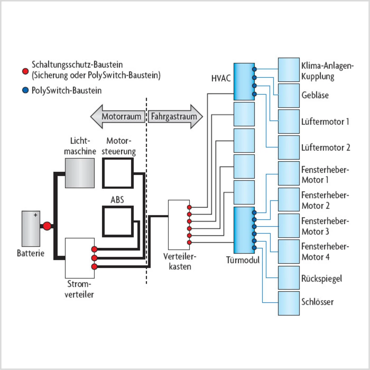Zum Schutz des Kabelbaums kann man Sicherungen einsetzen. Da es sich dabei aber um Einweg-Bauteile handelt, muss man sie ersetzen, sobald sie durchgebrannt sind. Daher muss man sie in gut zugänglichen Sicherungskästen montieren. Dies setzt eine bestimmte Systemarchitektur voraus und erzwingt somit Kompromisse bei Struktur und Systemaufbau. Dem gegenüber sind PPTC-Bausteine rücksetzbar und erfordern keinen Zugriff durch den Fahrer.