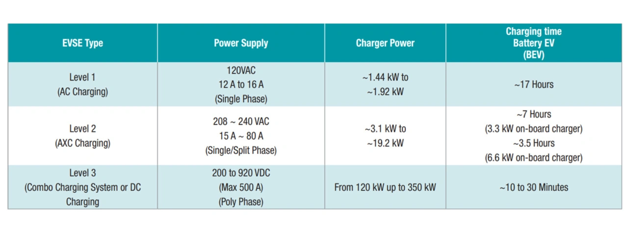EV-Ladesäulen werden in mehrere Leistungs-Kategorien unterteilt (siehe Tabelle). Level 1 und 2 umfassen AC-Ladestationen mit bis zu 20 kW. Zum Level 3 gehören DC-Schnellladestationen mit typisch 50 kW und mehr. Hier sind Werte bis zu 350 kW möglich.
