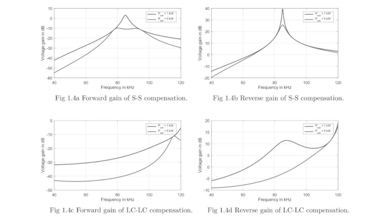 Typische Spannungsübertragungsfunktionen einer S-S- (Serial-Serial) und LC-LC-Kompensation (Inductance-Capacitance) sind in Bild 4 dargestellt. Die Spulenposition ist fest auf die Abgabe von 1 kW und 5 kW eingestellt. Die Diagramme zeigen die Funktionen sowohl im Vorwärts- als auch im Rückwärtsmodus. Der Lastgütefaktor sollte nicht zu hoch sein, da sonst der erforderliche Betriebsbereich die Spezifikation des Umrichters überschreiten kann.