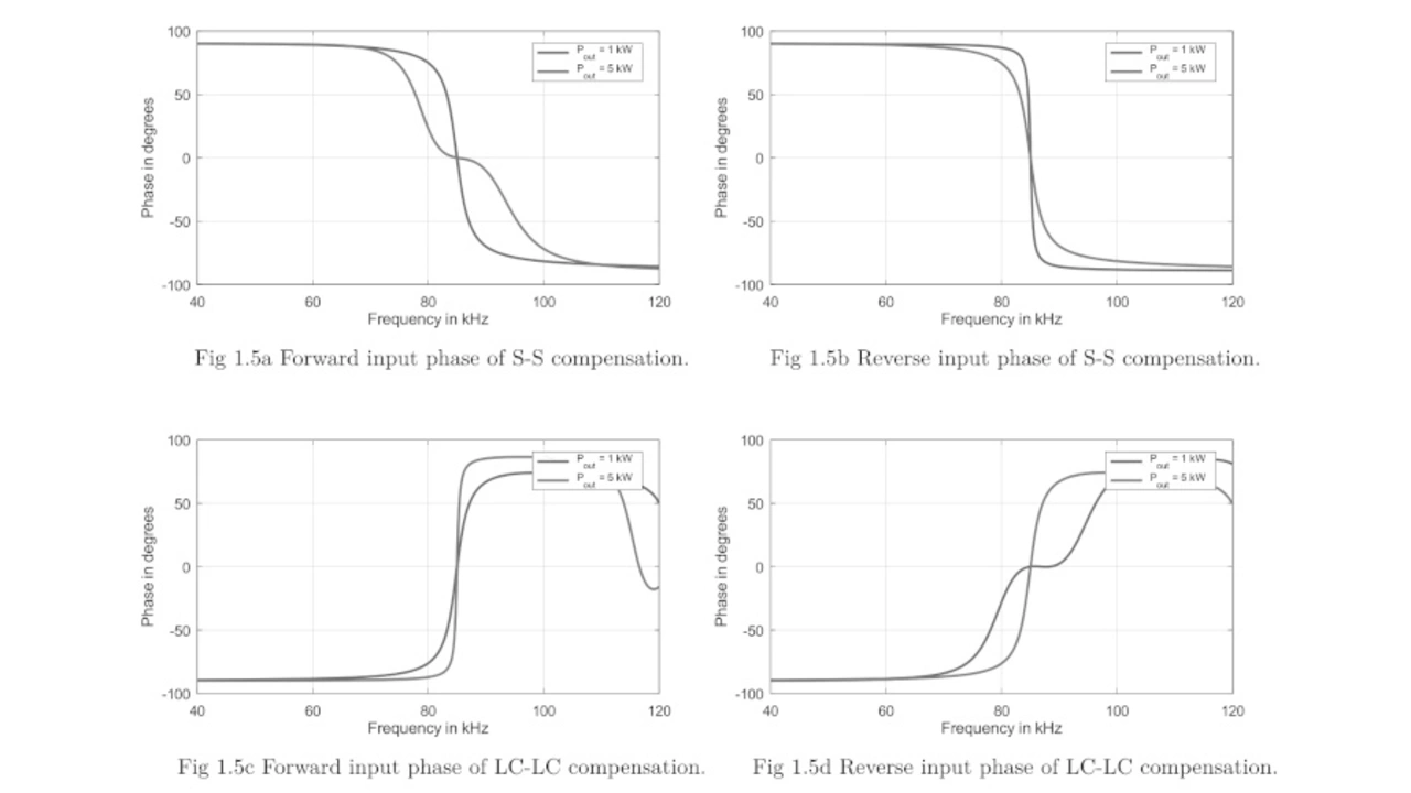 Auf der anderen Seite schöpft ein niedriger Gütefaktor den verfügbaren Betriebsbereich nicht voll aus. Wie man am LC-LC-kompensierten Verstärkungsverhalten erkennen kann, variiert die Verstärkung nur wenig, und beim S-S-Vorwärtsverhalten erfolgt das Pol-Splitting bei höheren Leistungen. Damit ist das Regelungssystem schwerer zu dimensionieren. Das dementsprechende Eingangsphasenverhalten ist in Bild 5 dargestellt. Der Phasengang beginnt sich (über den Betriebsbereich) im S-S-Vorwärtsmodus abzuflachen, was den verfügbaren ZVS-Bereich (Zero-Voltage Switching) begrenzt. Im Rückwärtsmodus dagegen erfordern die durch hohe Gütefaktoren bedingten starken Änderungen eine hohe Blindleistung. Der gleiche Trend ist bei der LC-LC-Kompensation zu beobachten, jedoch mit vertauschtem Verhalten.