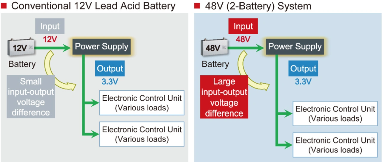 Ein wesentlicher Unterschied zwischen konventionellen und Mild-Hybrid-Fahrzeugen ist die Nennspannung der Batterie. Bei MHEV ist sie mit 48 V viermal so hoch. Da jedoch alle anderen elektrischen und elektronischen Einheiten einschließlich der Steuergeräte mit den bisher gängigen niedrigen Spannungen arbeiten, erhöht sich für die Stromversorgungs-ICs die Differenz zwischen der Eingangsspannung und der Ausgangsspannung (Bild 2).