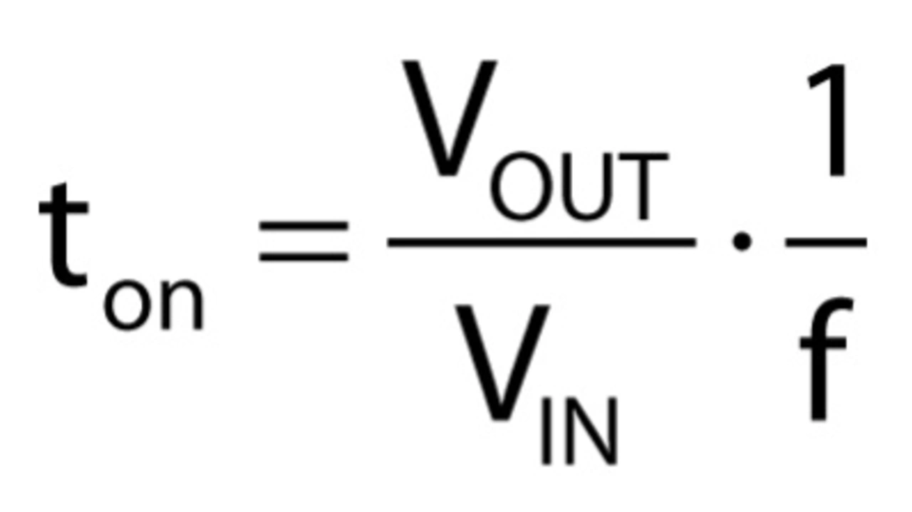 Die Wandlung einer hohen Eingangsspannung in eine niedrige Ausgansspannung bei hoher Schaltfrequenz erfordert eine kleine Schaltimpulsbreite. Das stellt momentan noch eine erhebliche technische Herausforderung dar. Der Zusammenhang zwischen Eingangsspannung, Ausgangsspannung, Schaltfrequenz und Schaltimpulsbreite berechnet sich wie folgt: