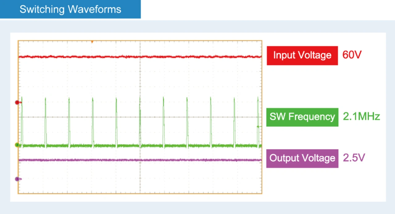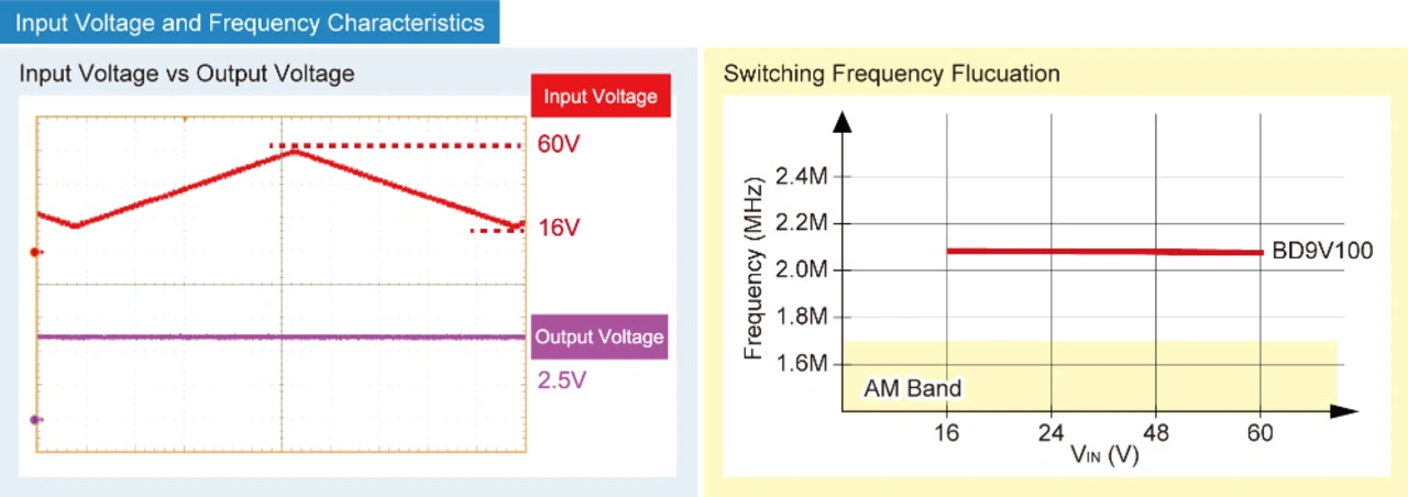 Als erster IC arbeitet der BD9V100MUF-C-Baustein mit der neuartigen Technologie. Um aus der maximal in 48-V-Systemen auftretenden Batteriespannung von bis zu 60 V die gewünschten 3,3 V bei einer Schaltfrequenz von 2.1 MHz zu erhalten, beträgt die erforderliche Pulsbreite ca. 30 ns, unter Berücksichtigung von Schwankungen von Last und Stromversorgung deutlich weniger als 30 ns. Der neue Nano-Puls-IC kann bis zu 9 ns kurze Schaltpulse erzeugen. So lässt sich mit einer Pulsbreite von 20 ns bei einem Eingangsspannungbereich von 16 V bis 60 V eine stabile Ausgangsspannung von 2,5 V erzeugen. Dies entspricht einem Abwärtswandlerverhältnis von bis zu 24:1 (Bild 4 und Bild 5).