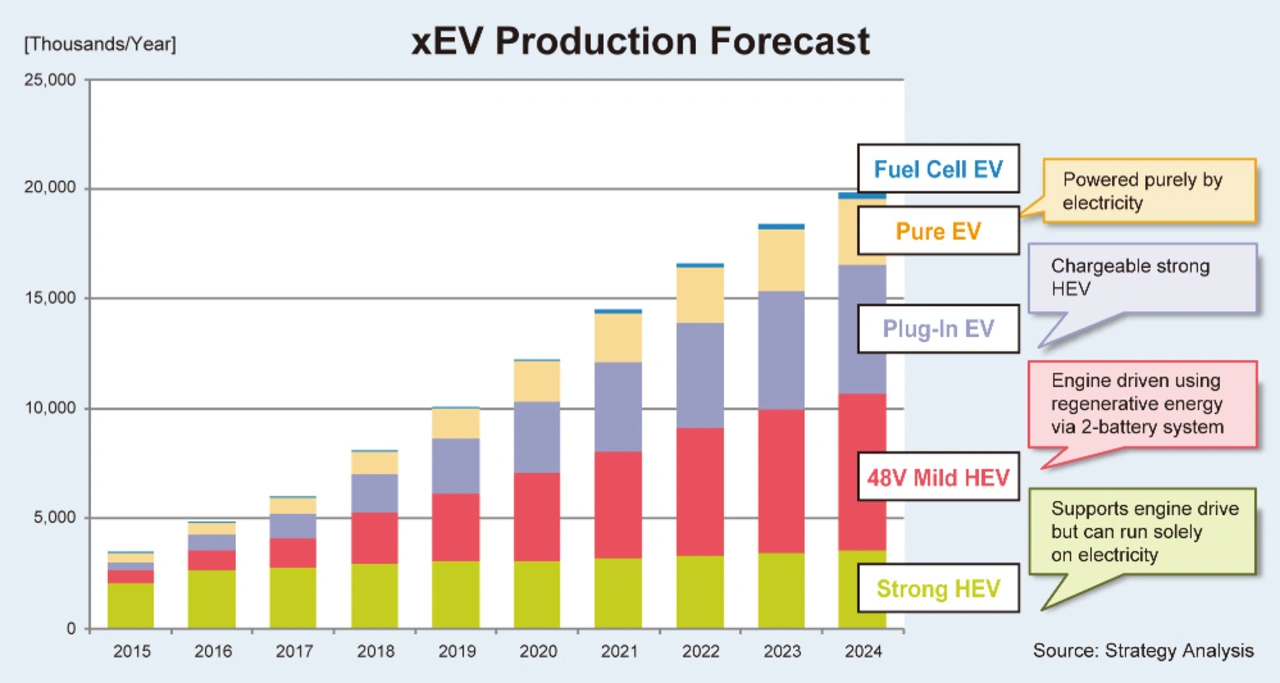 Das sind zum einen reine Elektroautos, die ihren Antriebsstrom aus Akkus ziehen oder Fahrzeuge, die über einer Brennstoffzelle Wasserstoff in elektrische Energie umwandeln. Die verschiedenen Hybrid-Varianten sind Voll-Hybride, bei denen die Batterie während der Fahrt mit regenerativer Energie aufgeladen wird und die auch rein elektrisches Fahren erlauben, Plug-in-Hybride, die an einer Steckdose aufgeladen werden können und schließlich Mild-Hybride (Mild Hybrid Electric Vehicles, MHEV), die eine 48-V-Batterie mit regenerativer Energie aufladen und mithilfe eines 48-V-Riemen-Starter-Generators (RSG) einen Start-Stopp-Betrieb und die elektrische Verstärkung des Verbrennungsmotors ermöglichen. Allein im Segment der 48-V-Mild-Hybriden werden 7,1 Millionen Fahrzeuge bis 2024 prognostiziert (Bild 1).