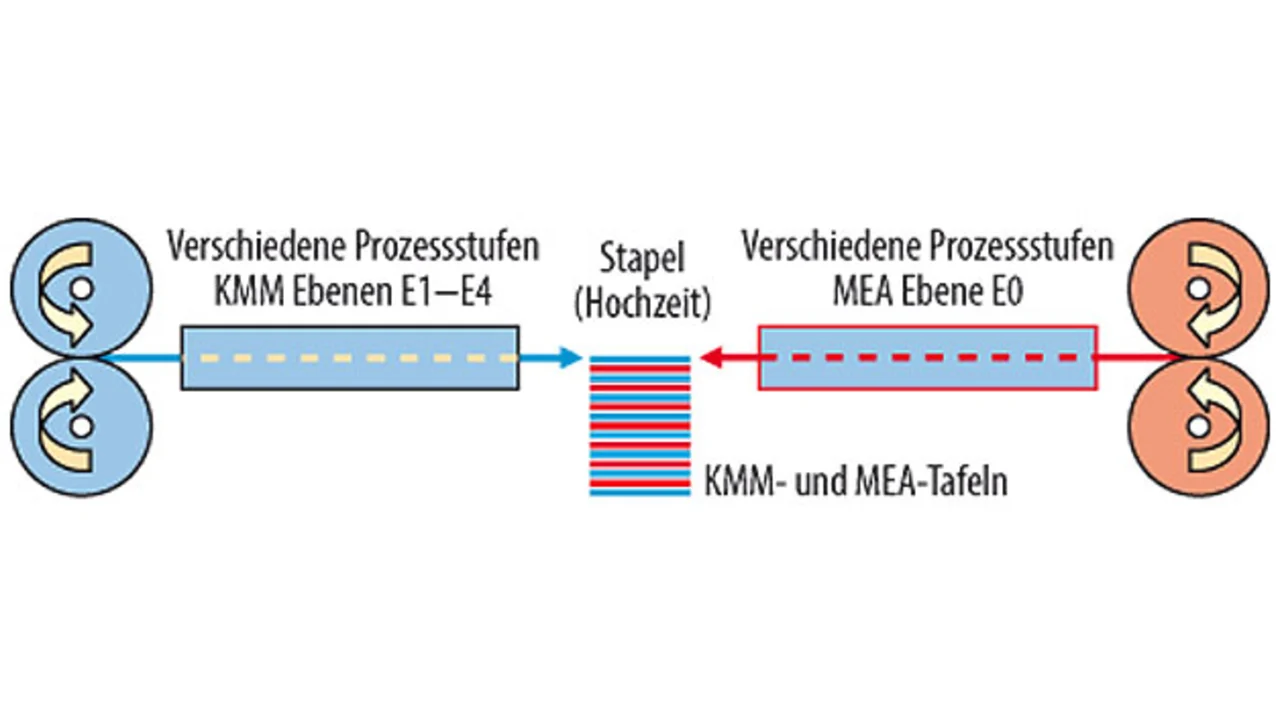 Kühl- und Medienmodule lassen sich mit kontinuierlichen Prozessen herstellen, beispielsweise durch die Folienabwicklung und Folienverarbeitung vom Coil mit Bandgeschwindigkeiten von 50 m/Minute, bei einer Standard-Folienbreite von etwa 2,2 m. Dabei werden sogenannte KMM-Tafeln mit beispielsweise 16 Nutzen (Stapelquerschnitte) gefertigt, die im Bereich der „Hochzeit“ quergeteilt und zu einer Stapelgruppe vereint werden, wie Bild 2 zeigt. Danach finden die Endmontage der Stapel oder der Stapelgruppe, die Vereinzelung der Stapel und schließlich die Gehäusemontage mit Gehäusevorfertigung sowie die weiteren Prozesse bis zum Versand statt.