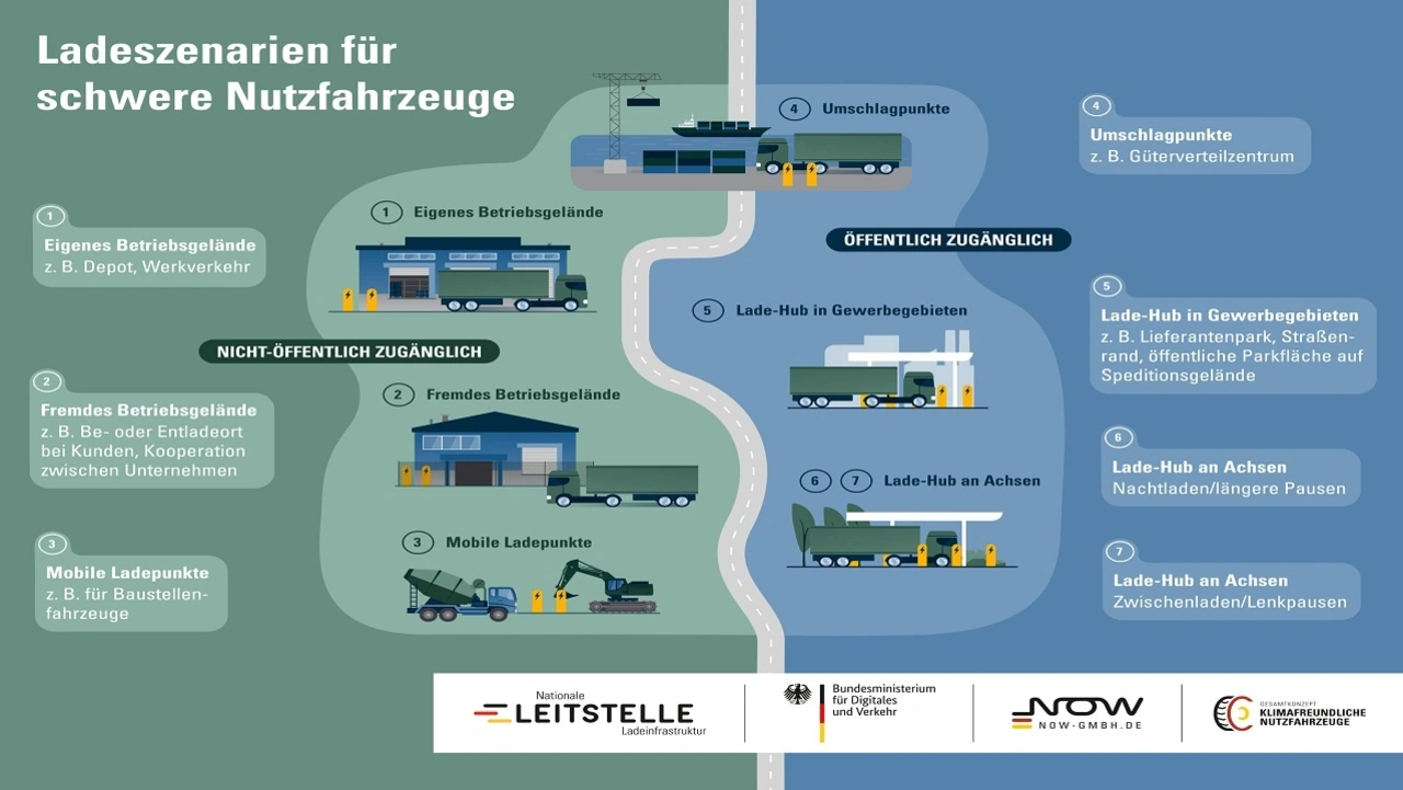 Dazu zählen im nicht-öffentlichen Raum: unternehmenseigene Betriebsgelände, fremde Betriebsgelände und Depots und mobile Ladepunkte. Im öffentlichen Raum sind es: Lade-Hubs in Gewerbegebieten, Lade-Hubs an Achsen beim Nachtladen und längeren Pausen sowie Lade-Hubs an Achsen beim Zwischenladen und Lenkpausen. Laden an Umschlagpunkten findet sowohl im öffentlichen als auch im nicht-öffentlichen Raum statt.