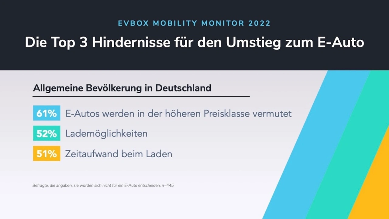 Der zweithäufigste Grund in Deutschland ist die Ungewissheit, ob und wo eine Ladestation vorhanden ist, wenn sie benötigt wird (52 Prozent). Die Annahme, dass das Laden teurer ist als das Tanken, ist weniger verbreitet als früher (25 Prozent im Jahr 2022 gegenüber 39 Prozent im Jahr 2020). Schließlich sind vier von zehn Europäern der Meinung, dass das Laden von E-Fahrzeugen zu viel Zeit in Anspruch nimmt – in Deutschland ist es sogar jeder Zweite.