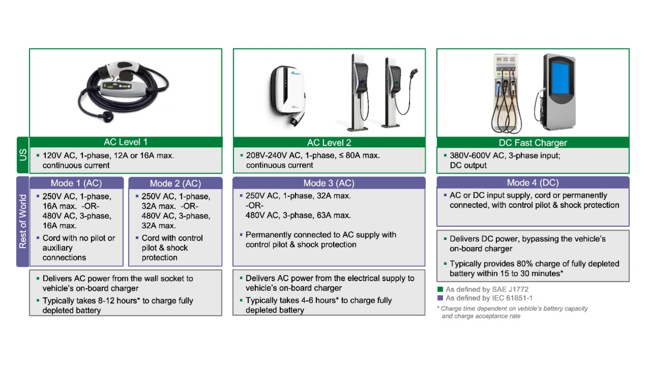 Bild 1 zeigt verschiedene Arten von Ladestationen. In Nordamerika werden die Ladestationen in »Level« eingeteilt, in der Europäischen Union nach Betriebsarten (»Modes«). Die Society of Automotive Engineers, die Organisation für Automobilstandards der Europäischen Union sowie asiatische Länder wie Japan und China arbeiten an der Standardisierung von Ladestationen.