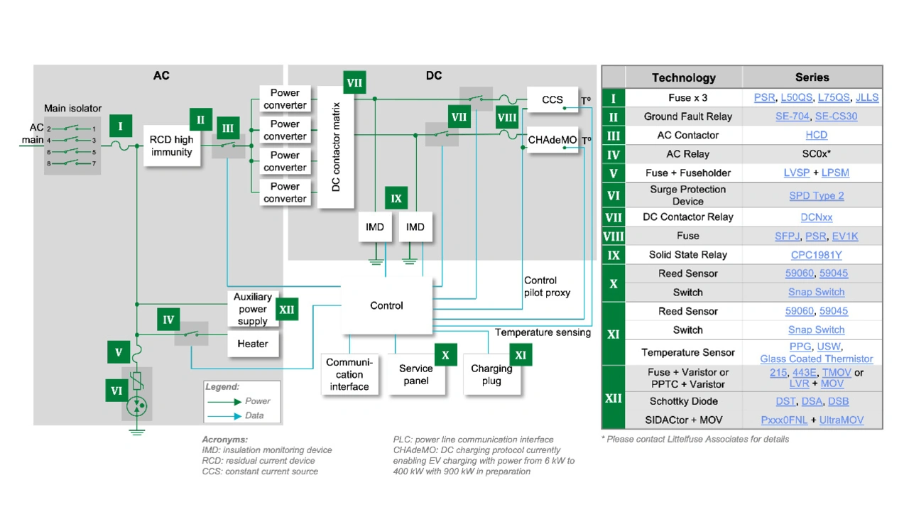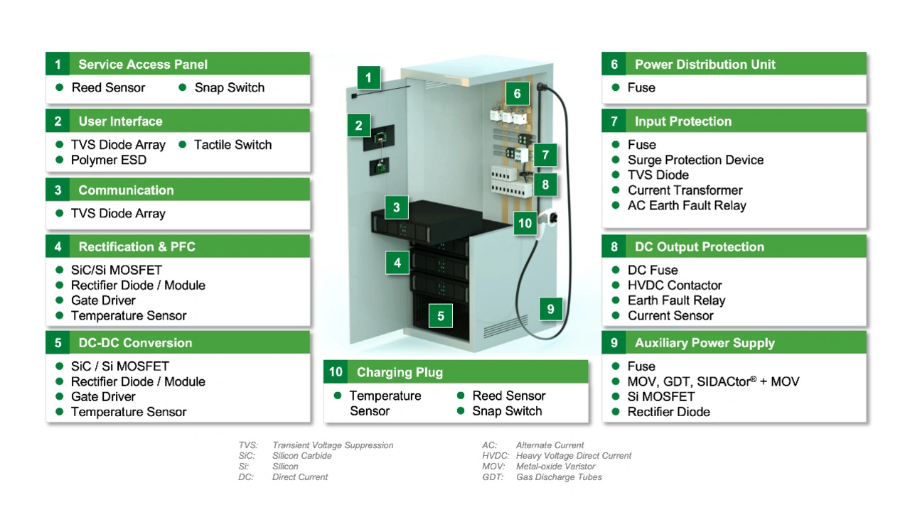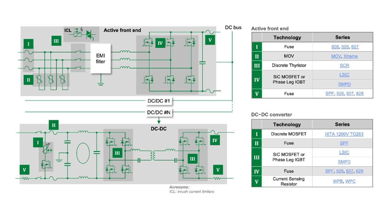 Die Stromwandlerschaltungen des Gleichstrom-Ladegeräts besitzen auch eine Schnittstelle zur Wechselstromleitung. Sie benötigen eine Eingangssicherung und einen Überlastungsschutz. Mit schnellen Halbleitersicherungen lassen sich nachgeschaltete Halbleiterkomponenten schützen. Zum Schutz vor Transienten sollten entweder Metalloxidvaristoren (MOVs) und Gasentladungsröhren oder MOVs und Schutzthyristoren in Betracht gezogen werden. Untereinheiten von Ladegeräten mit geringerer Leistung benötigen nur MOVs oder einen MOSFET für den Transientenschutz der Sekundärebene.