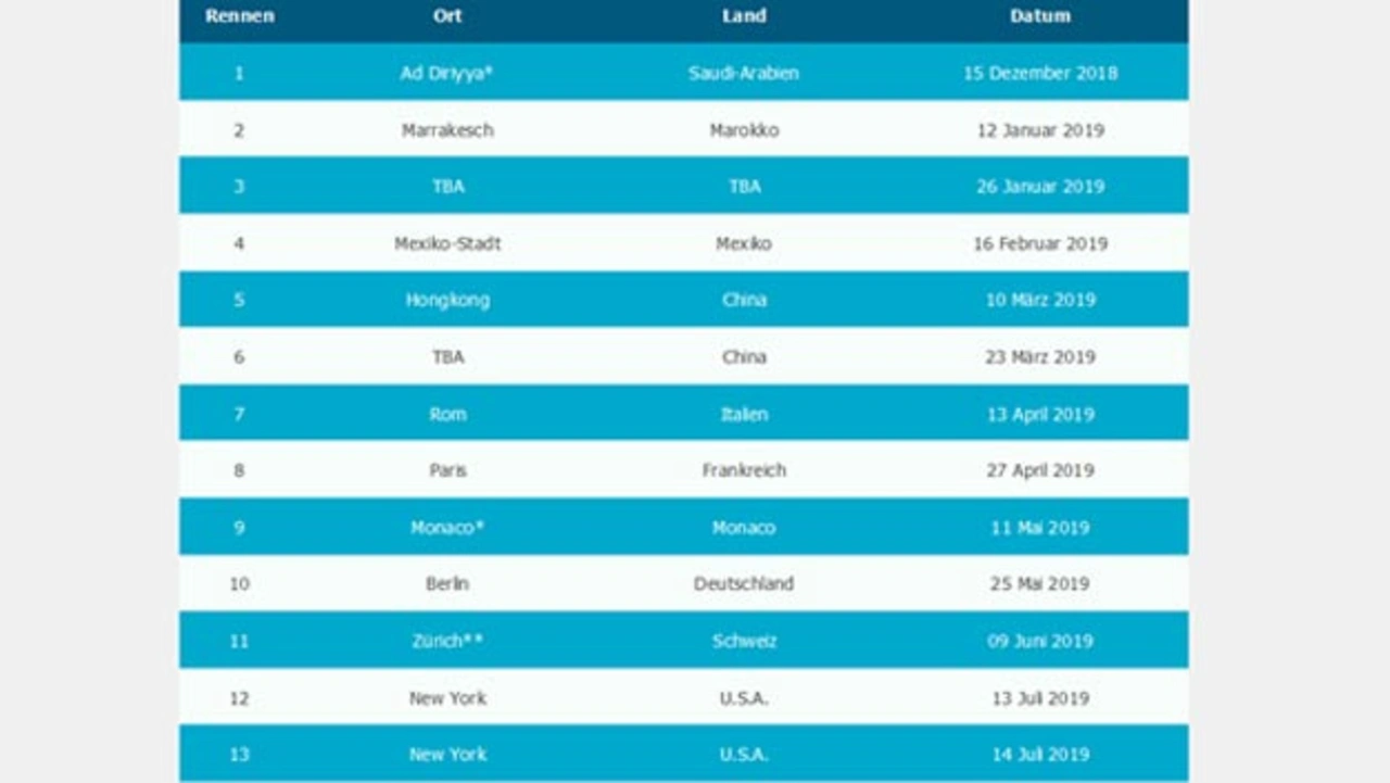 Der Weltmotorsportrat (WMSC) des Automobil-Weltverbandes FIA hat den Rennkalender für die kommende Formel-E-Saison beschlossen. Neben der erwarteten Rückkehr des Monaco E-Prix sowie dem bereits verkündeten Saisonstart in Saudi-Arabien gibt es bislang wenige Überraschungen – wenngleich zwei Austragungsorte noch nicht final feststehen. Die wichtigste Nachricht aus deutscher Sicht: Berlin bleibt im Rennkalender 2018/19, München wird nicht aufgeführt. Die fünfte Formel-E-Saison, in der erstmals das neue Gen-2-Fahrzeug zum Einsatz kommen wird, beginnt am 15. Dezember in Diriyya, eine Vorstadt von Riad, der Hauptstadt Saudi-Arabiens. Das Rennen in Berlin ist am 25.05.2019 geplant.