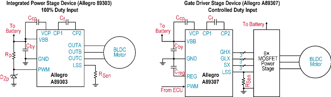 Motortreiber für Lüfter und Pumpen zur Batteriekühlung sind mit integriertem Controller erhältlich, einschließlich Optionen für eine integrierte Leistungsstufe oder eine Gate-Treiberstufe. Die für den Betrieb bei voller Drehzahl erforderlichen Komponenten können minimiert werden, wie zwei Beispiele von Allegro in Abbildung 1 zeigen: