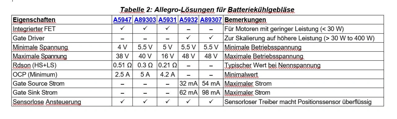 Allegro bietet eine breite Palette an Komponenten für die unterschiedlichsten Anforderungen, die Kunden haben, um ihre Elektrofahrzeugbatterien zu kühlen. Sie sind in Tabelle 2 gegenübergestellt. Bausteine mit integrierter Leistungsstufe (A5947, A89303, A5931) können eine typische Motorleistung von bis zu ~30 W verarbeiten, während Gate-Treiber (A5932, A89307) zur Ansteuerung externer MOSFETs verwendet werden können, die je nach Gate-Strom eine Leistung von bis zu ~400 W unterstützen. Integrierte Gate-Controller haben den eingebauten FOC-Regelalgorithmus (A89307), der gegenüber der Sinusregelung Vorteile in Bezug auf Effizienz und Rauschverhalten bietet.