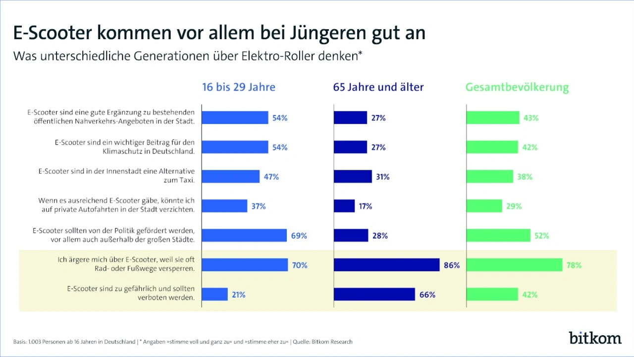 Weit verbreitet ist quer durch alle Altersgruppen der Ärger über achtlos abgestellte E-Scooter. So sagen 85 Prozent, dass E-Scooter die Innenstadt verunstalten, und 78 Prozent ärgern sich über E-Scooter, die oft Rad- und Fußgängerwege versperren.