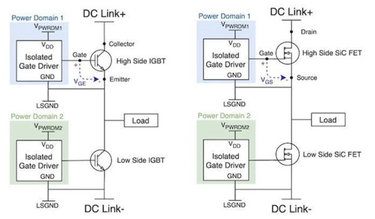 In EV-Systemen werden die positiven und negativen High-Voltage-Schienen oft als DC Link+ und DC Link- bezeichnet. Bild 1 beschreibt eine Halbbrückenschaltung aus IGBTs und eine aus Siliziumkarbid-(SiC-)FETs. Um einen IGBT einzuschalten, muss die Spannung vom Gate zum Emitter (UGE) einen bestimmten Schwellenwert überschreiten.