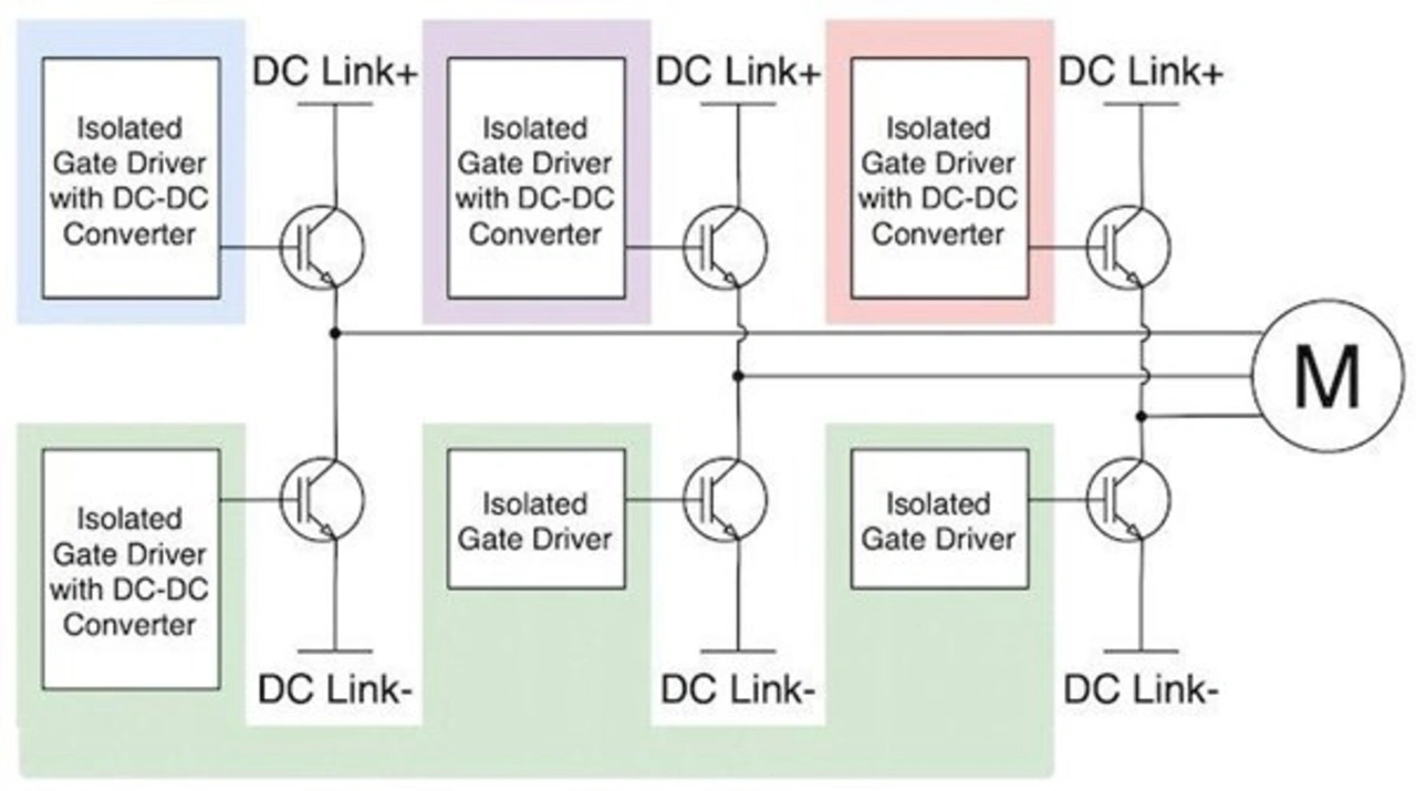 Viele komplexe Wandlertopologien enthalten mehr als eine Halbbrückenkonfiguration. Die Motoren in den Antriebssträngen von Elektrofahrzeugen sind meist 3-Phasen-Motoren, bei denen jede Phase ein- und ausgeschaltet wird, um eine Bewegung zu erzeugen. Der Traktionsumrichter verwendet drei Halbbrückenschaltungen, um jede Phase des Motors mit Strom zu versorgen. Bei sechs Leistungsbauelementen und Gate-Treibern hat die sorgfältige Planung der Stromverteilung der Gate-Treiber großen Einfluss auf die Leistungsfähigkeit. Der 3-Phasen-Wechselrichter veranschaulicht auch die Kompromisse bei verschiedenen Konfigurationen für die Stromverteilung. Diese sind auch für andere Systeme relevant, die nur eine oder zwei Halbbrückenschaltungen verwenden.