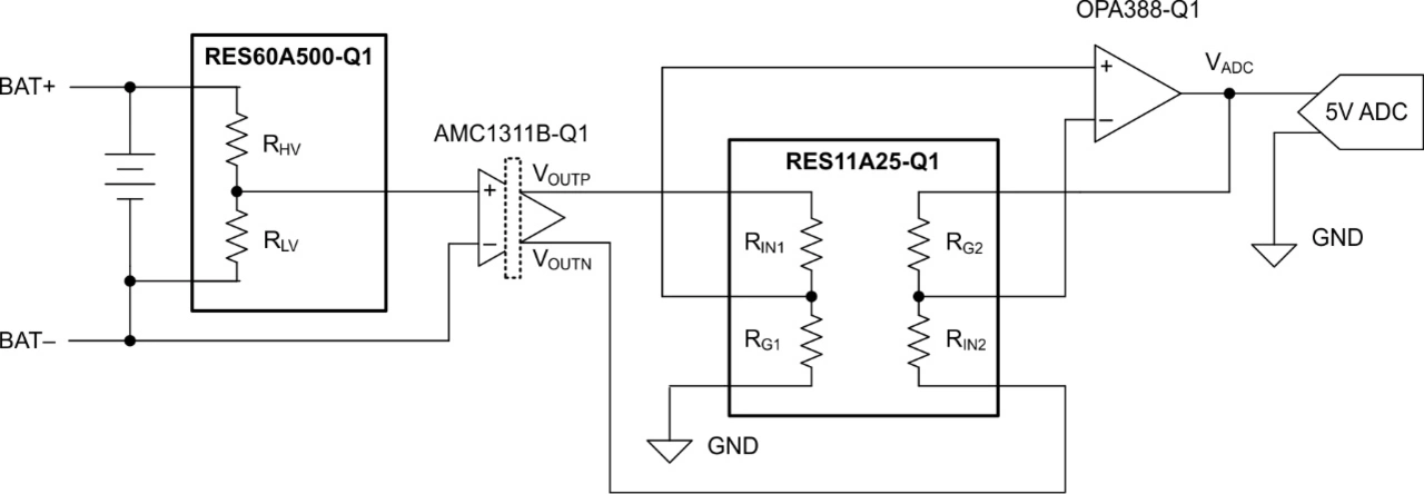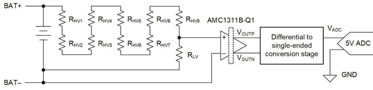 Um den ADC und weitere Niederspannungs-Bauelemente vor der relativ hohen Batteriespannung zu schützen, wird beispielsweise ein isolierter Verstärker benötigt, der als Barriere zwischen Hoch- und Niederspannungsteil dient. Obwohl sie als Brücke zwischen zwei Spannungsbereichen fungieren, vertragen auch isolierte Verstärker nur Spannungen ähnlich der Betriebsspannung von ADCs, folglich muss die Batteriespannung zuerst herabgesetzt werden. Meist geschieht dies mit einem Widerstandsteiler, der das Hochspannungssignal auf einen niedrigeren Bereich herabsetzt.