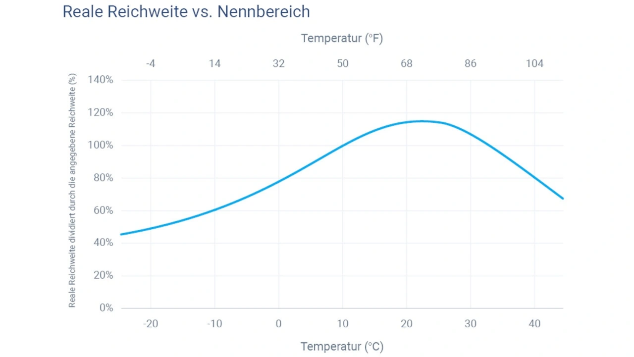 Hohe und kalte Temperaturen wirken sich stark auf die Leistung der Batterien von Elektroautos aus. Vor allem sorgen Zusatzlasten wie Heizung oder Klimaanlage für einen erhöhten Verbrauch und damit eine geringere Reisedistanz. Eine optimale Leistung erbringen die elektrischen Gefährte bei 21,5 °C.