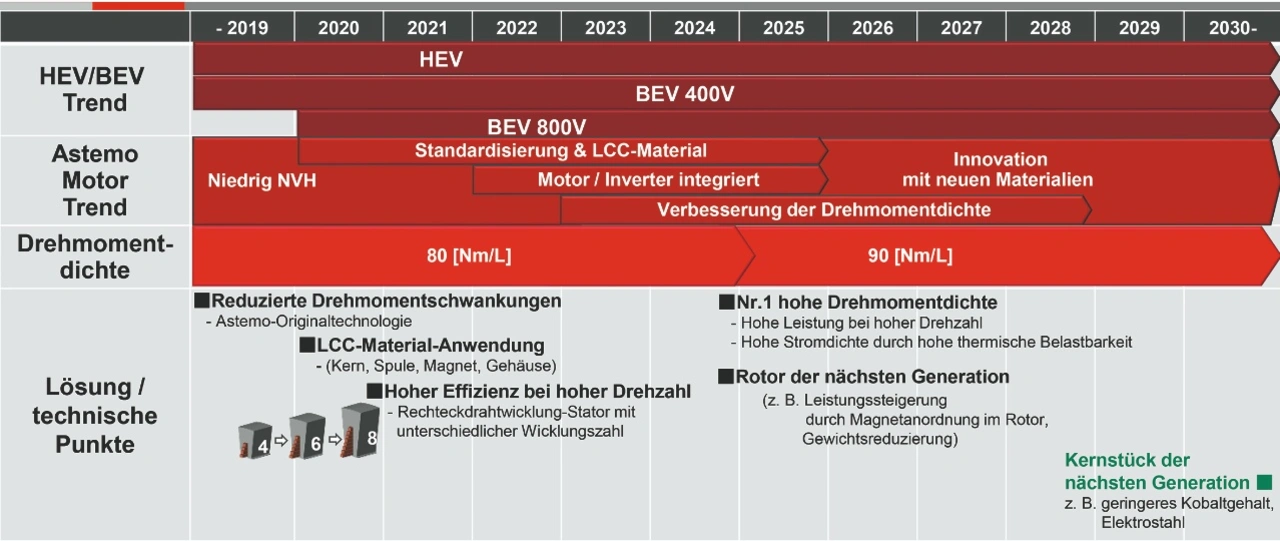 Heutige Systeme sind laut seiner Aussage zum Großteil 400-V-Ansätze, wobei Astemo auch 800-V-Systeme beliefert. Aus seiner Sicht bestimmen diverse Anforderungen an E-Motor und Inverter die Weiterentwicklungen. In diesem Zusammenhang erwähnt er beispielsweise beim E-Motor die Wicklungstechnologie, eine direkte Öl-Kühlung oder der Unterschied zwischen radialem und axialem Fluss, aber auch Themen wie neue Magnetdesigns und damit die Reduzierung des Bedarfs an seltenen Erden bis hin zu Magnet-freien Designs. Beim Inverter geht es natürlich um SiC, aber auch um die Reduktion von Gewicht und Größe, um das thermische Management und um Themen wie schnelles Laden oder auch Sicherheit.
