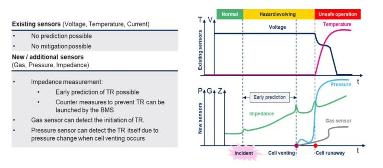 Laut GB 38031-2020 [11] (seit Januar 2021 gültig für alle in China verkauften EVs), muss ein Akkusatz oder ein System fünf Minuten, bevor es aufgrund von Wärmeausbreitung zu einer Gefahrensituation im Fahrgastraum kommt, weil ein einzelner Akku thermisch instabil wird, ein Warnsignal zur Meldung eines thermischen Ereignisses ausgeben. Bild 3 zeigt einen Vergleich zwischen klassischen Batteriesensoren (Spannung, Temperatur, Strom, Druck und Gasbildung) und zeigt deren Grenzen beim Vorhersagen und Fortschreiten einer thermischen Instabilität auf. Zusätzlich wird illustriert, wie durch Impedanzmessung eine frühzeitige Vorhersage des Entstehens und Fortschreitens einer thermischen Instabilität möglich ist.