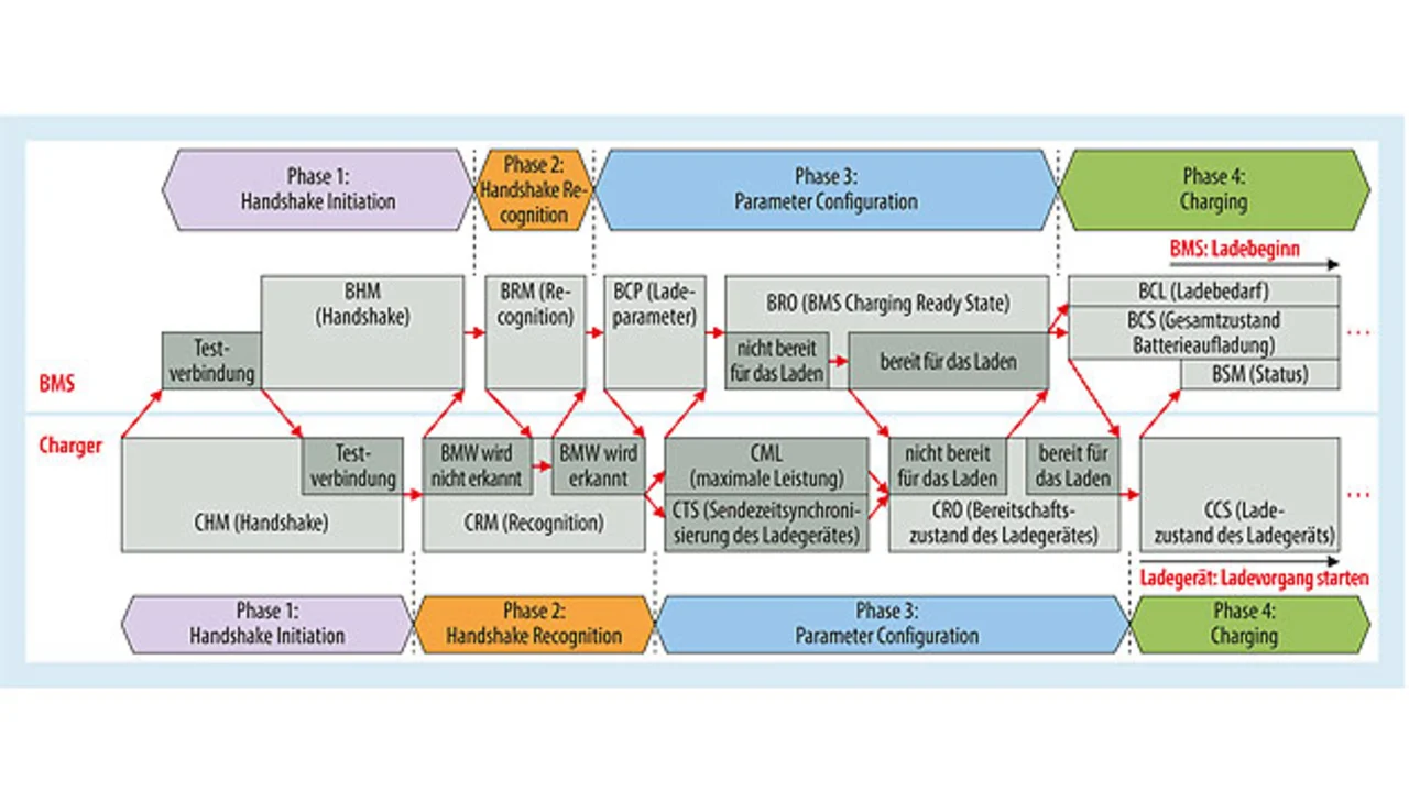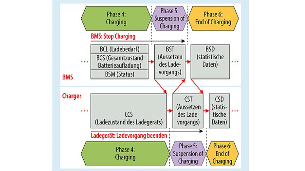 Bei Phase 4, dem eigentlichen Ladevorgang, verläuft die Kommunikation deutlich übersichtlicher, weil keine Zustandsübergänge mehr stattfinden. BMS und Charger senden sich ihre Botschaften zyklisch und unabhängig voneinander zu: Das Fahrzeug leitet den Ladeprozess ein, über die Botschaft BCL (Battery Charging Demand) sendet es die Anforderungen an die Ladesäule und informiert diese mit Hilfe der Botschaften BCS (Overall Battery Charging Status), BSM (Power Storage Battery Status Information) und weiteren über den eigenen Zustand. Die Ladesäule wiederum versendet die Botschaft CCS (Charger‘s Charging Status) und informiert das Fahrzeug über seinen Zustand, den bereitgestellten Strom sowie die maximal generierbare Spannung.