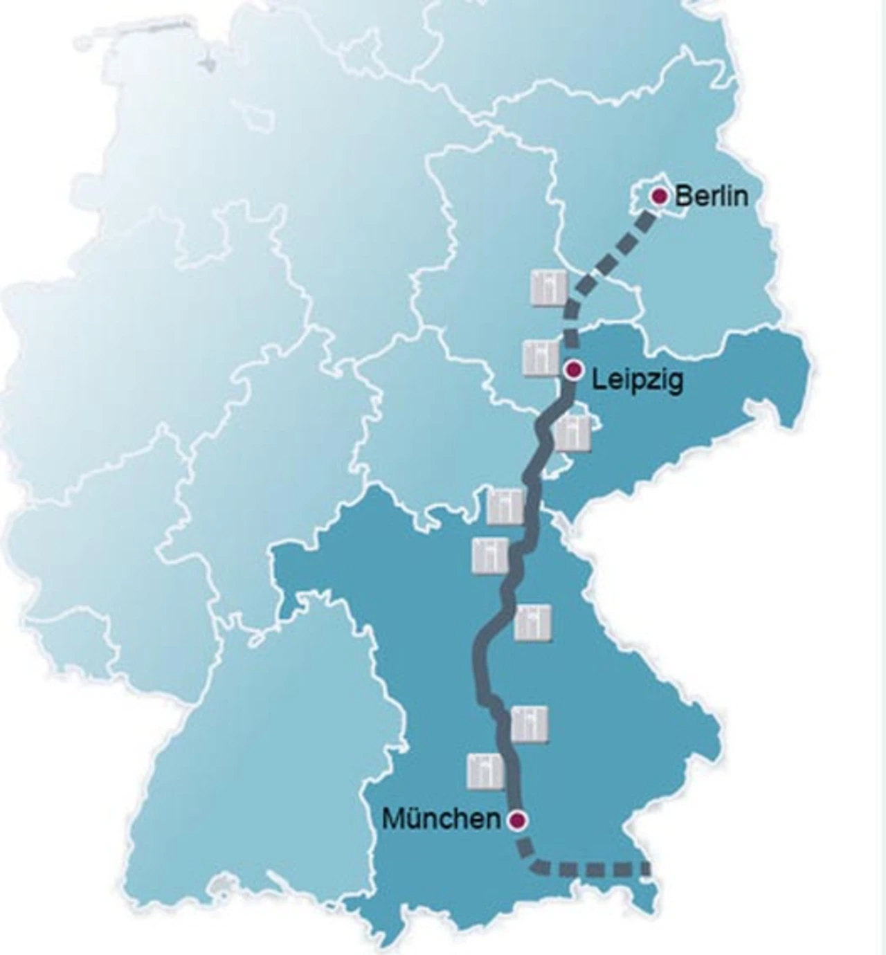 Gemeinsam mit den Partnern BMW, E.ON und Siemens vereinfacht Hubject die Langstreckenmobilität für Elektroautofahrer entlang der Hauptverkehrsachse in Deutschland. Durch die Vernetzung der Schnellladestationen über intercharge lassen sich Elektrofahrzeuge auf der 430 km langen Strecke von Leipzig nach München schnell und einfach laden.
