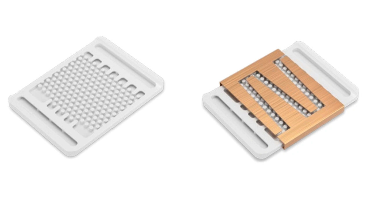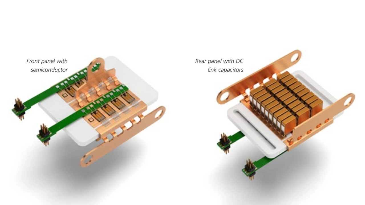 Ein weiterer großer Vorteil ist, dass sich die Pin-Fin-Struktur an die Grundfläche der aufgesinterten SiC-Halbleiter anpassen lässt, indem sich unter der Kühlfahne die gleiche Anzahl von Kühlpins befindet. Dadurch lassen sich die Chips optimal kühlen. Durch die Gestaltung des Kühlkörpers lässt sich die Wärme der SiC-Halbleiter auf der Oberseite des Kühlkörpers optimal abführen, während der Zwischenkreiskondensator auf der Unterseite des Kühlkörpers über eine Metallisierung, die den Kühler umschließt, niederinduktiv in das Leistungsmodul integriert ist.